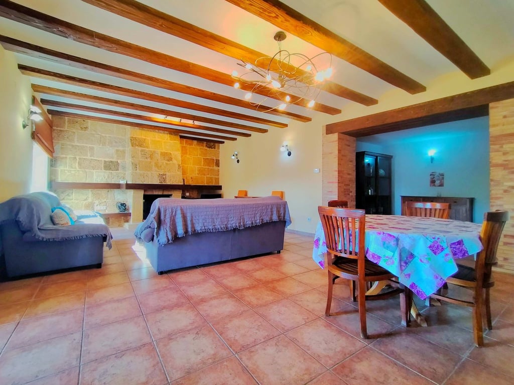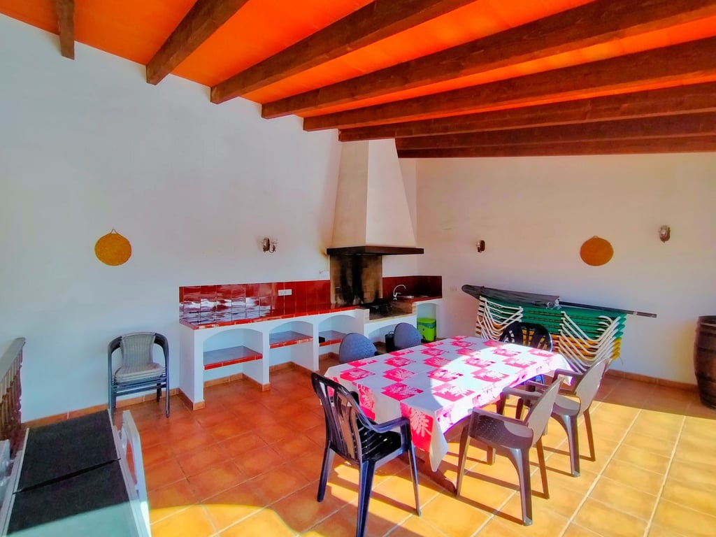 Buiten hebben we een grote garage met open haard, momenteel gebruikt als recreatiegebied, een overdekte barbecue met een grote ruimte beneden voorbereid voor een kelder, verschillende fruitbomen en een zwembad.