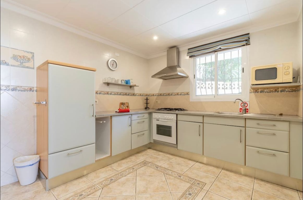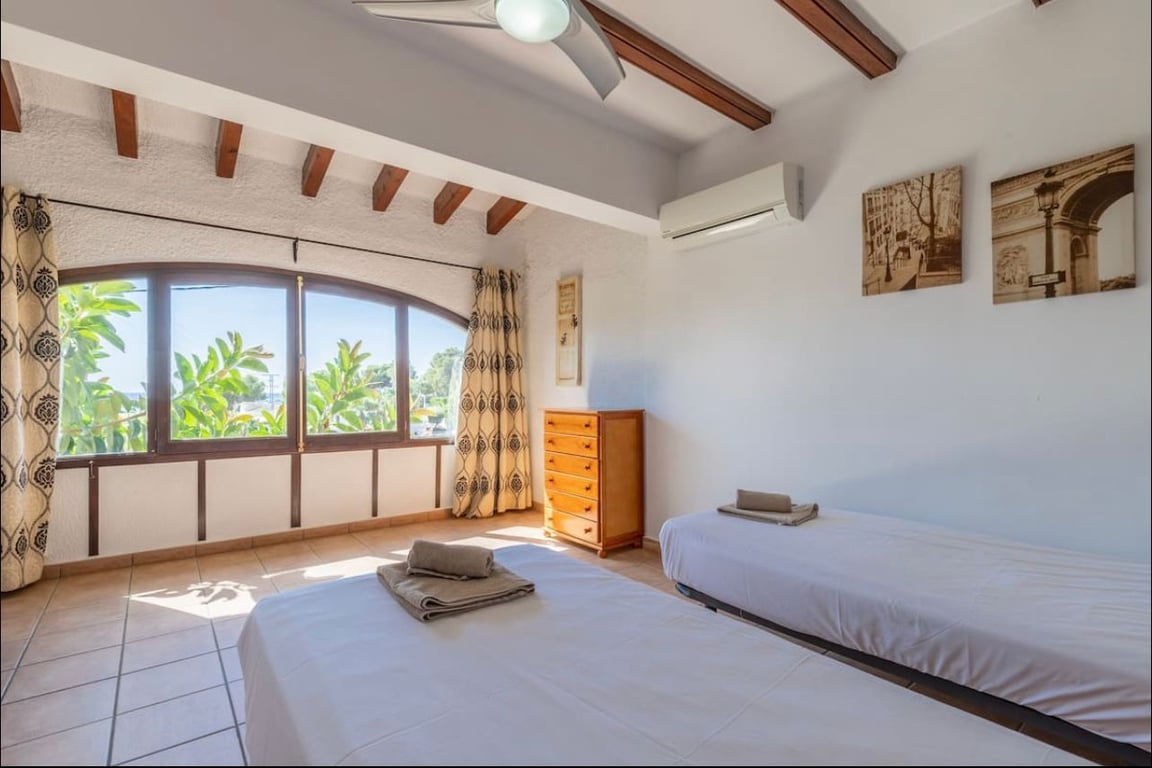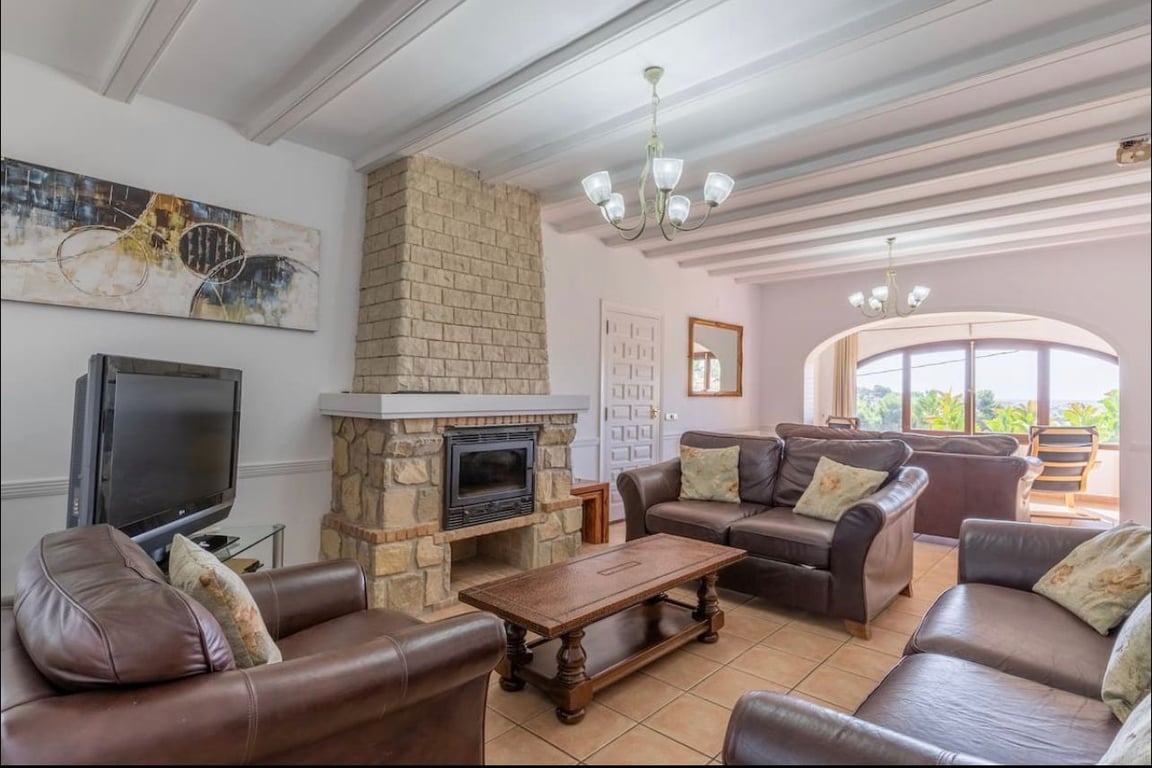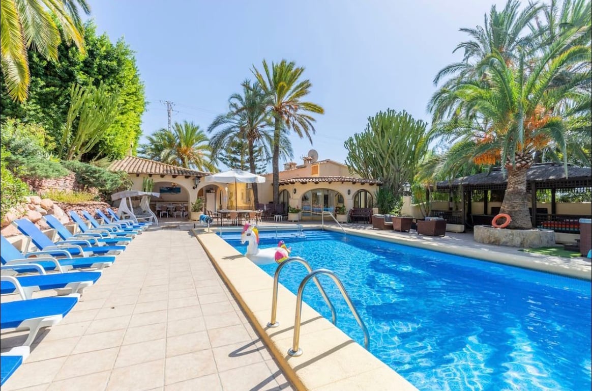 Great rental investment! This property is located within walking distance to amenities and to Moraira town centre. Entering the plot there is a parking space. This villa is distributed over two storeys with an independent apartment on the lower floor. From the right of the garage steps lead up to a mature garden and the independent apartment consisting of open plan kitchen, dining/living room two bedrooms with bathroom. The main living area consists of a large open naya leading into a good size fully equipped kitchen, doors lead into a large living room with fireplace and various seating areas, two bedrooms lead off from here. A hallway takes you to a further three bedrooms and two bathrooms. From this floor there are sea views. There are a further three bedrooms and two bathrooms within the property ready for accommodation. Outside the property is surrounded by mature garden, terraced and seating areas and many trees providing shade. On the main floor a large pool terrace holds the large swimming pool, a gazebo with Jacuzzi and games area. There is a covered/enclosed summer kitchen with bbq. There is also an outside toilet. Behind this is the utility room. Additional amenities include Wi-Fi, air conditioning in all rooms, central heating, feature fireplace and much more. This property is perfect for a rental investment, it has a long rental history and is fully prepared to continue this way. Or it could also be a good family holiday home. Being able to accommodate family members in different areas of the property and then meeting in the communal areas.