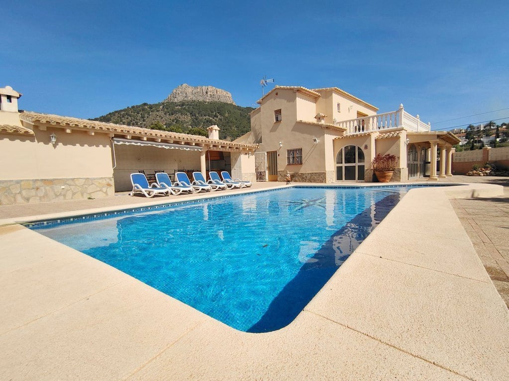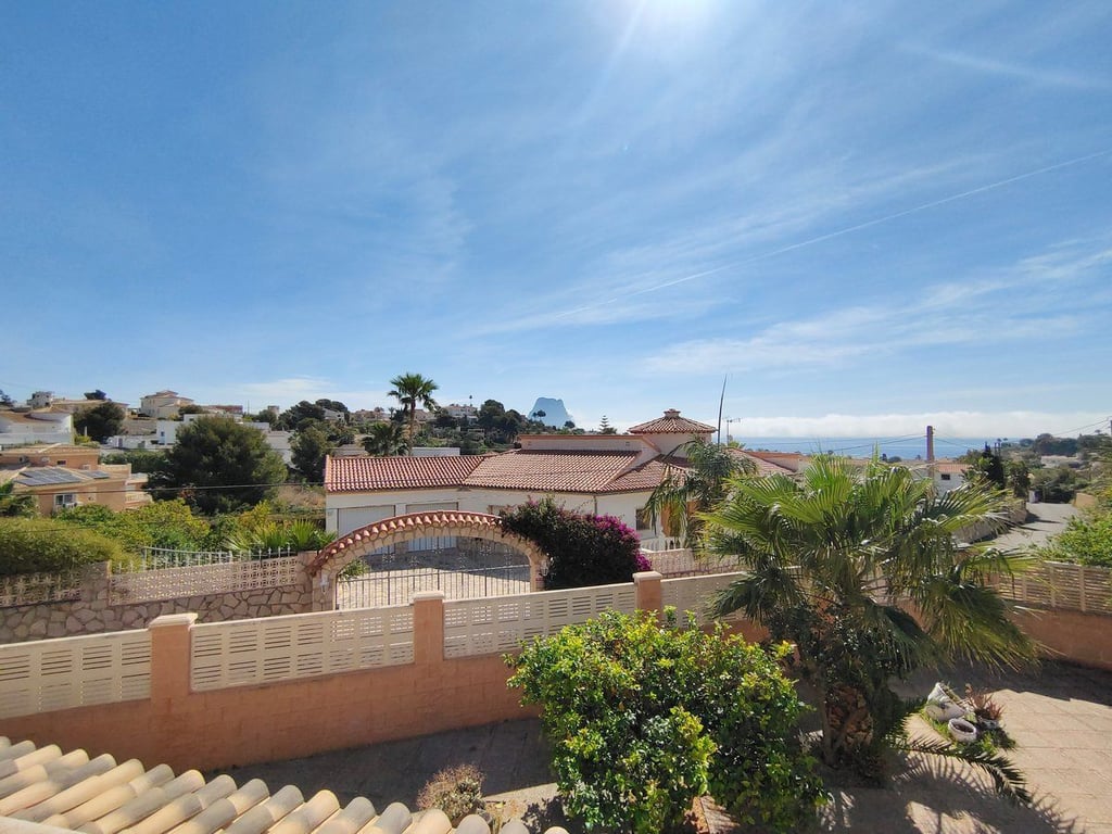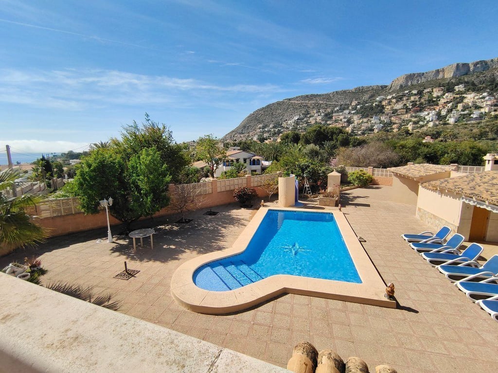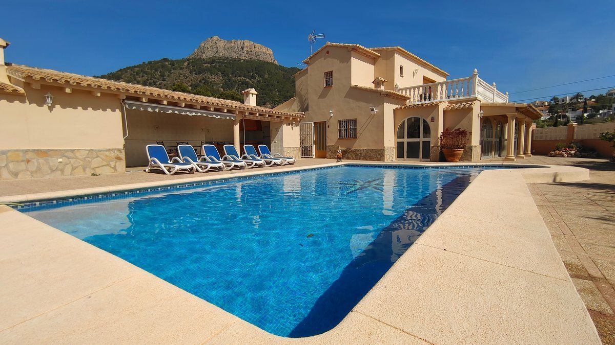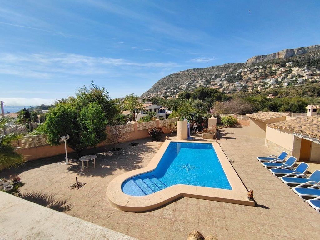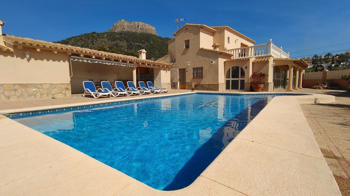 Villa located in a very peaceful urbanization called Canuta de Ifach, just a 5-minute drive from the beautiful crystal clear beaches that Calpe offers us. The house is south-facing and also has spectacular panoramic sea views. It is situated on a large plot of 1,480 m2 and has a constructed area of 290 m2 distributed over two floors as follows: Main floor: 3 bedrooms with built-in wardrobes, 2 complete bathrooms (1 en-suite), independent kitchen, a spacious living/dining room with a fireplace and access to the cozy glazed porch that leads outside. Upper floor: 2 bedrooms with built-in wardrobes, 1 complete bathroom, an auxiliary living room, and a beautiful terrace. Exterior: A large outdoor terrace where we find a rectangular 8x4 meter pool, a summer kitchen and a barbecue area, and 1 complete bathroom. In addition, there is a large garage and a storage room. As extras: it has air conditioning, a low maintenance garden with automatic irrigation, and a large parking area. In this villa, you will find tranquility, beautiful views of Calpe, and more. It has been renovated and is currently in perfect condition.