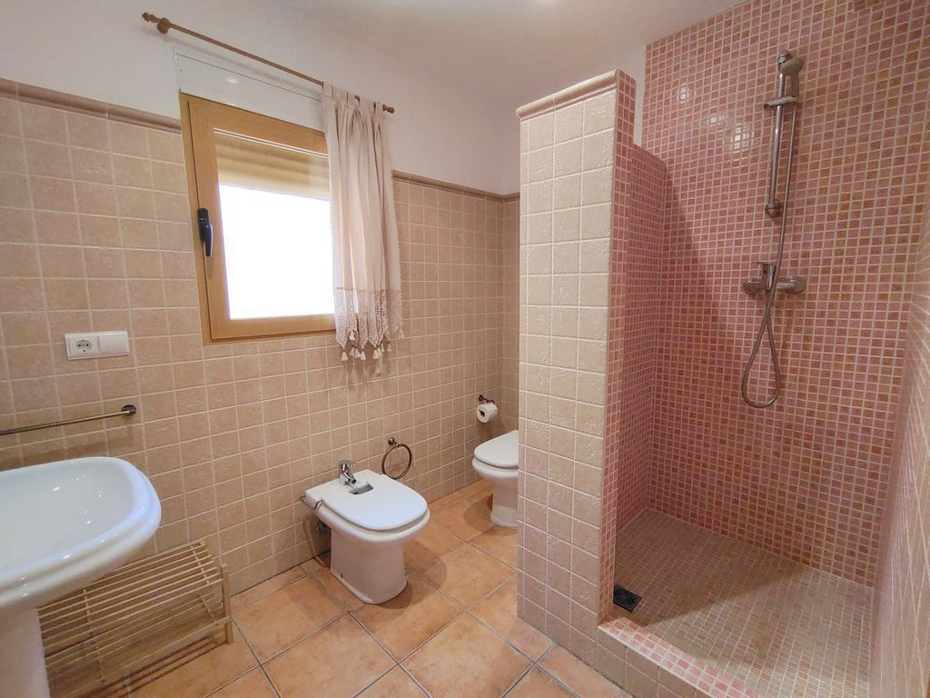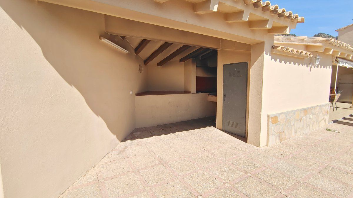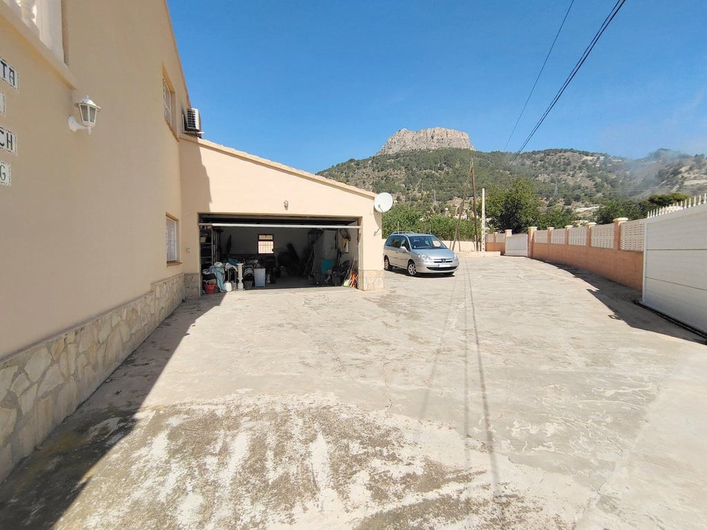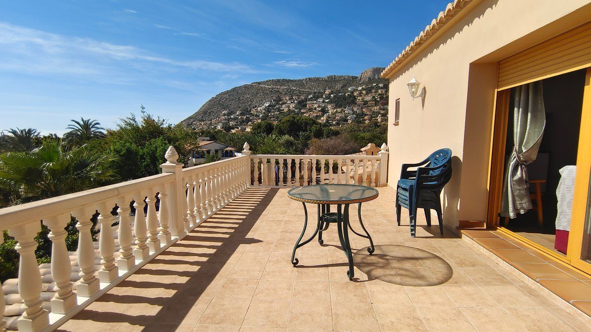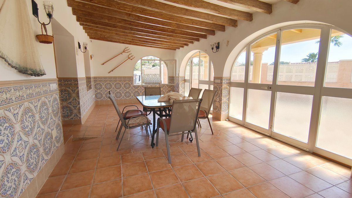 Villa located in a very peaceful urbanization called Canuta de Ifach, just a 5-minute drive from the beautiful crystal clear beaches that Calpe offers us. The house is south-facing and also has spectacular panoramic sea views. It is situated on a large plot of 1,480 m2 and has a constructed area of 290 m2 distributed over two floors as follows: Main floor: 3 bedrooms with built-in wardrobes, 2 complete bathrooms (1 en-suite), independent kitchen, a spacious living/dining room with a fireplace and access to the cozy glazed porch that leads outside. Upper floor: 2 bedrooms with built-in wardrobes, 1 complete bathroom, an auxiliary living room, and a beautiful terrace. Exterior: A large outdoor terrace where we find a rectangular 8x4 meter pool, a summer kitchen and a barbecue area, and 1 complete bathroom. In addition, there is a large garage and a storage room. As extras: it has air conditioning, a low maintenance garden with automatic irrigation, and a large parking area. In this villa, you will find tranquility, beautiful views of Calpe, and more. It has been renovated and is currently in perfect condition.