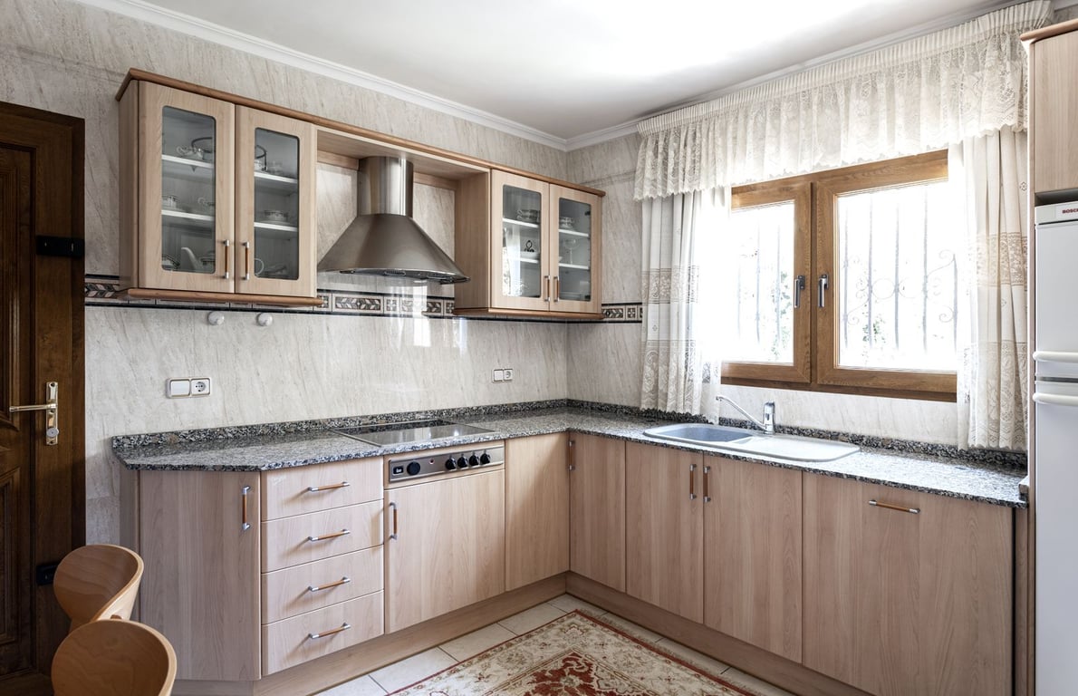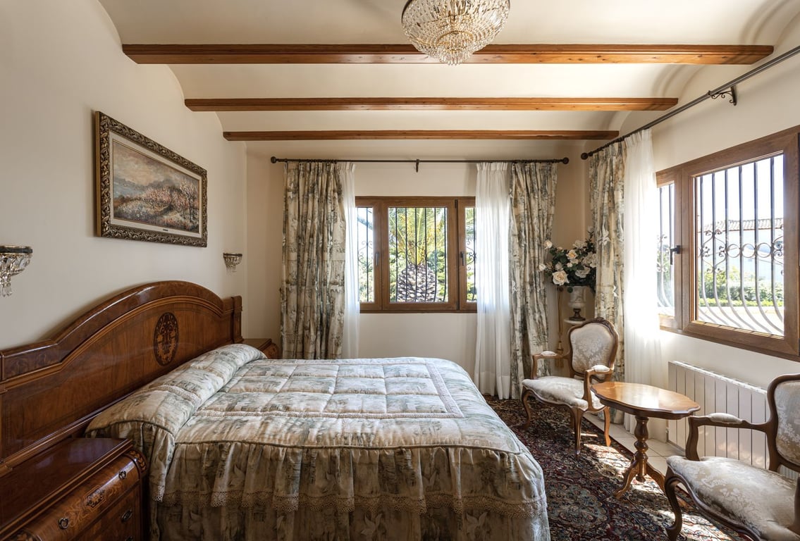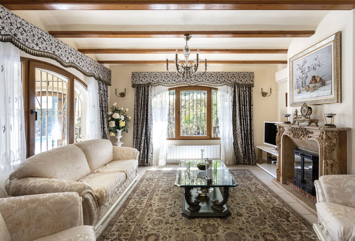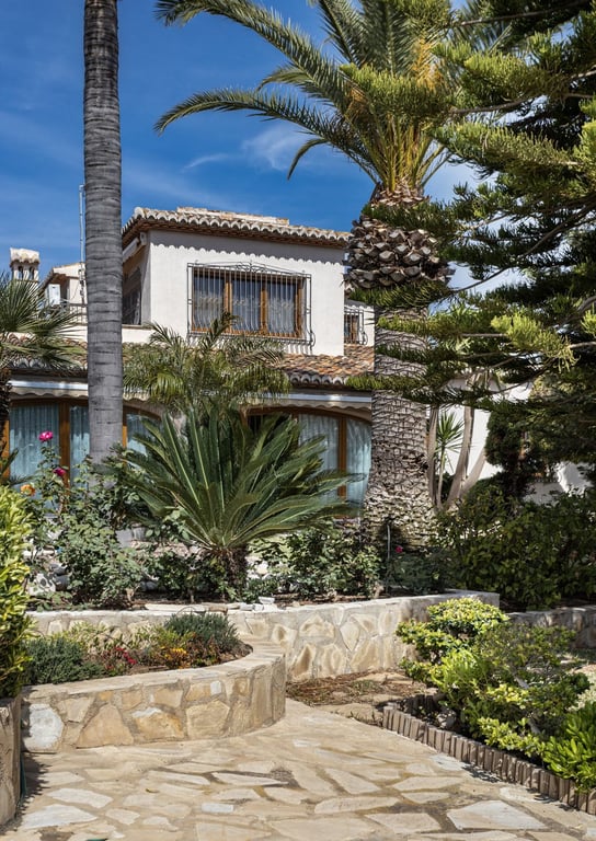 This beautiful fully furnished two-story villa is located in Xabia, Alicante and sits on a 1,058 m2 lot with lush Mediterranean planting, including Royal Palm Trees.
