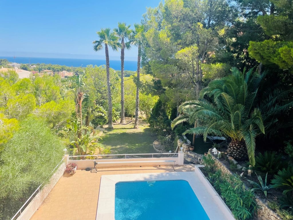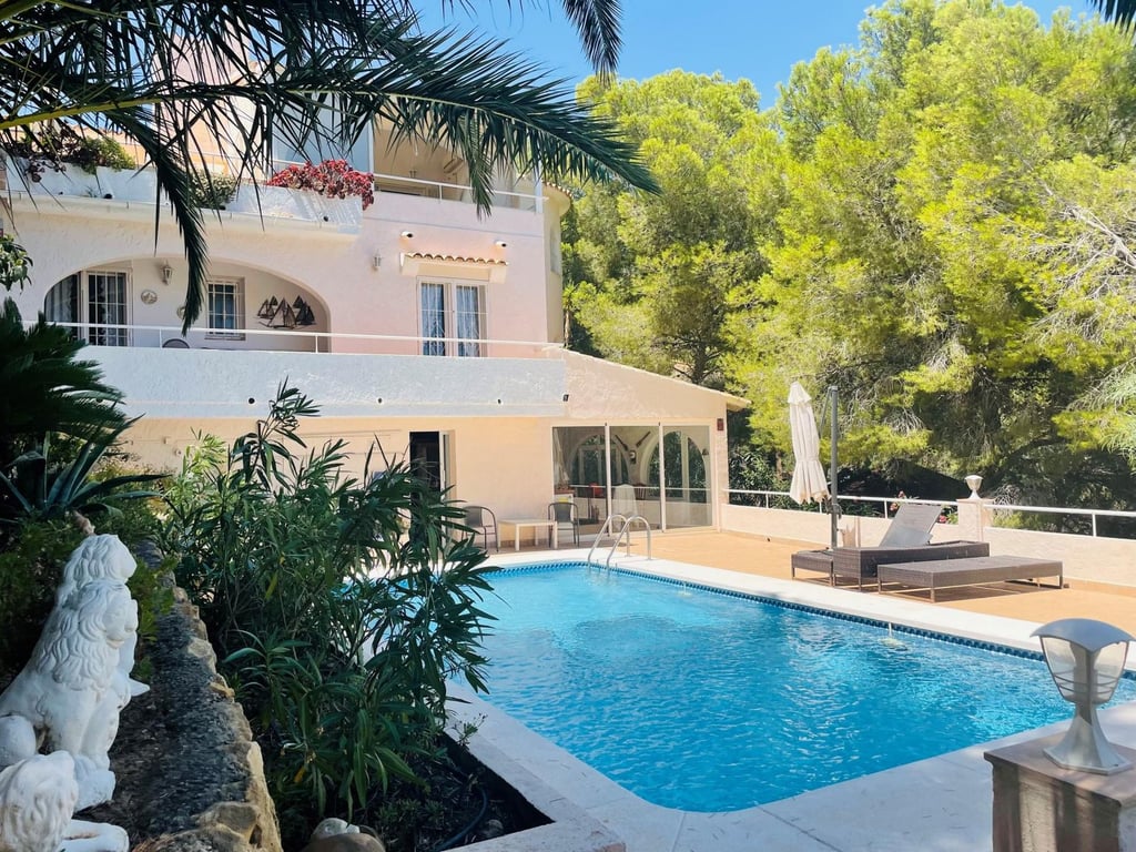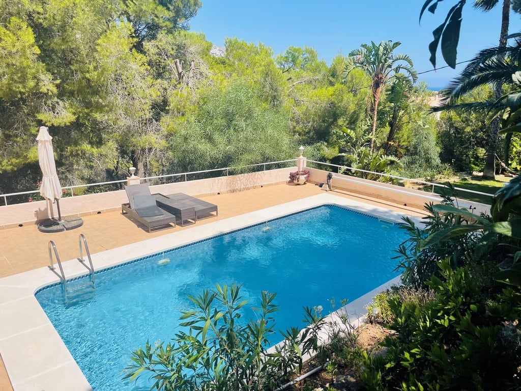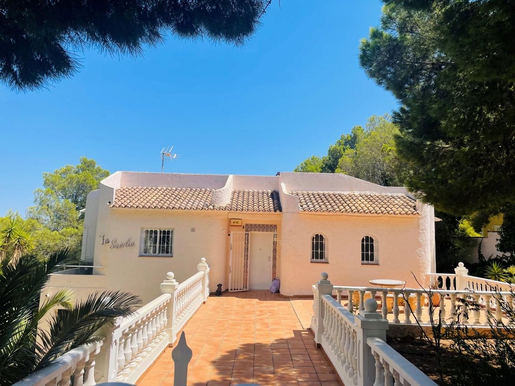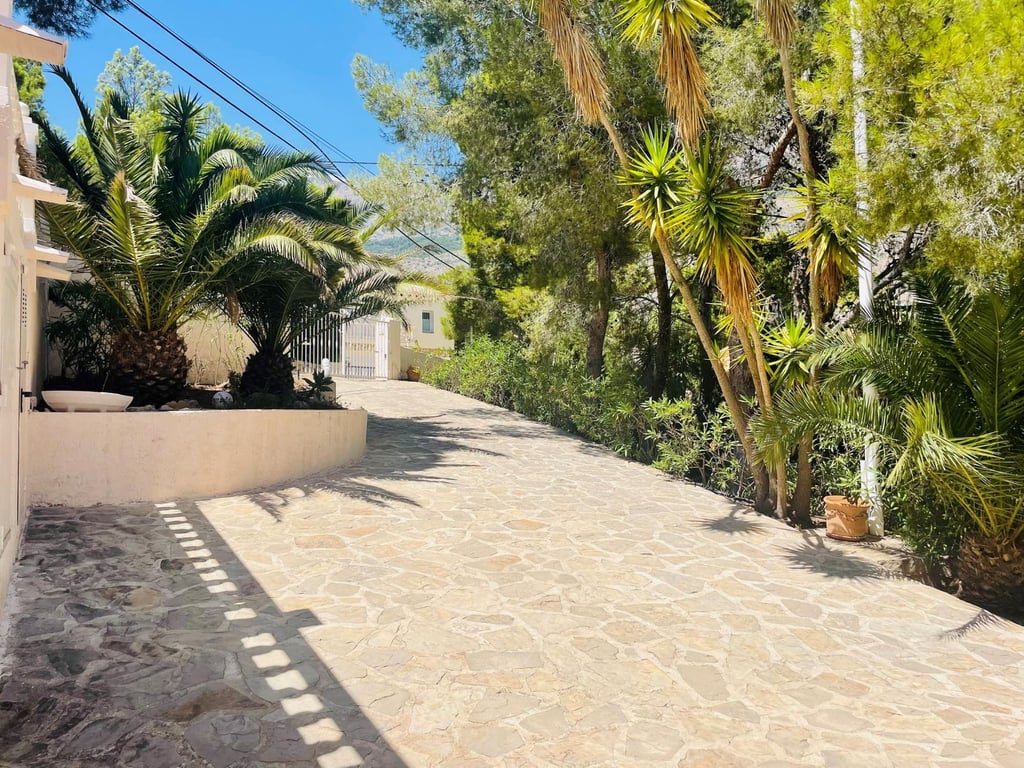 Mooie villa in Altea la Vella met uitzicht op de zee en de bergen.. Prachtige villa in Altea la Vella met uitzicht op zee en de bergen en in een exclusieve wijk rond de golfbaan van Don Cayo, Altea. Villa met een totaal bebouwd oppervlak van 200 m2 en is gelegen op een spectaculaire locatie op een perceel van 1800 m2 en zeer dicht bij de golfbaan en het mooie dorp Altea la Vella. De villa heeft verschillende niveaus met een klassieke stijl en is gelegen in een zeer rustige wijk van de Sierra de Altea. Het huis heeft twee hoofdingangen, vanaf de tweede en de eerste verdieping. Op de begane grond is er een grote woon-eetkamer met open haard met een ingerichte keuken, een gastentoilet, toegang tot een beglaasd terras en een ruime slaapkamer met badkamer en suite en ook met toegang tot een onoverdekt en zeer zonnig terras met uitzicht op zee. Een buitentrap leidt naar de benedenverdiepingen en naar het dakterras met een groot solarium.  Via de interne trap van het huis naar de eerste verdieping is er nog een grote woonkamer met een bar, drie slaapkamers, een aparte badkamer en een bijkeuken met wasmachine. Op de begane grond bevindt zich een ruime gastensuite, een zomerkeuken en een wellnessruimte met jacuzzi, sauna, douche en toilet.  In de tuinen van de villa bevindt zich een gezellige houten gazebo met een centrale open haard en omgeven door de natuur; ernaast is er een kleine ruimte die gebruikt kan worden als speelplaats of als extra terras. Het is een heel gezellige en zeer besloten plek. Het zout-chloor zwembad is omgeven door een tuin met palmbomen en mediterrane dennen met automatische irrigatie. De villa heeft ook een garage en meerdere parkeerplaatsen.  Op een steenworp afstand van de golfbaan Cayo Altea, 3 km van het strand, 2 km van Altea la Vella, en 65 km van de luchthaven van Alicante.