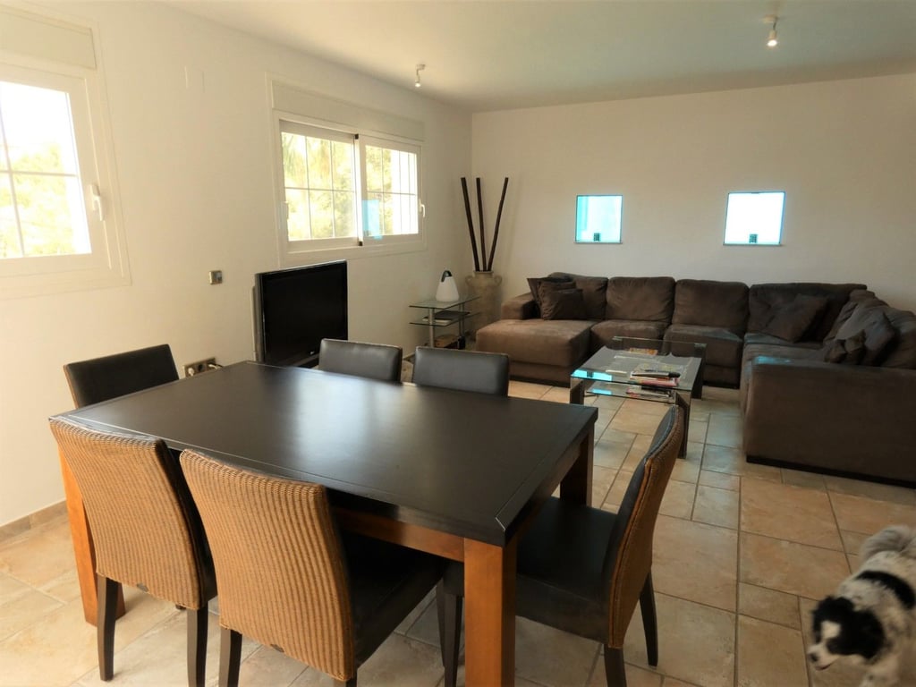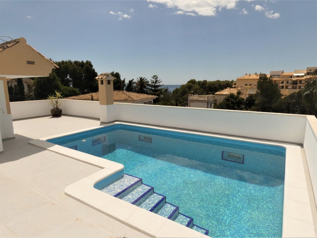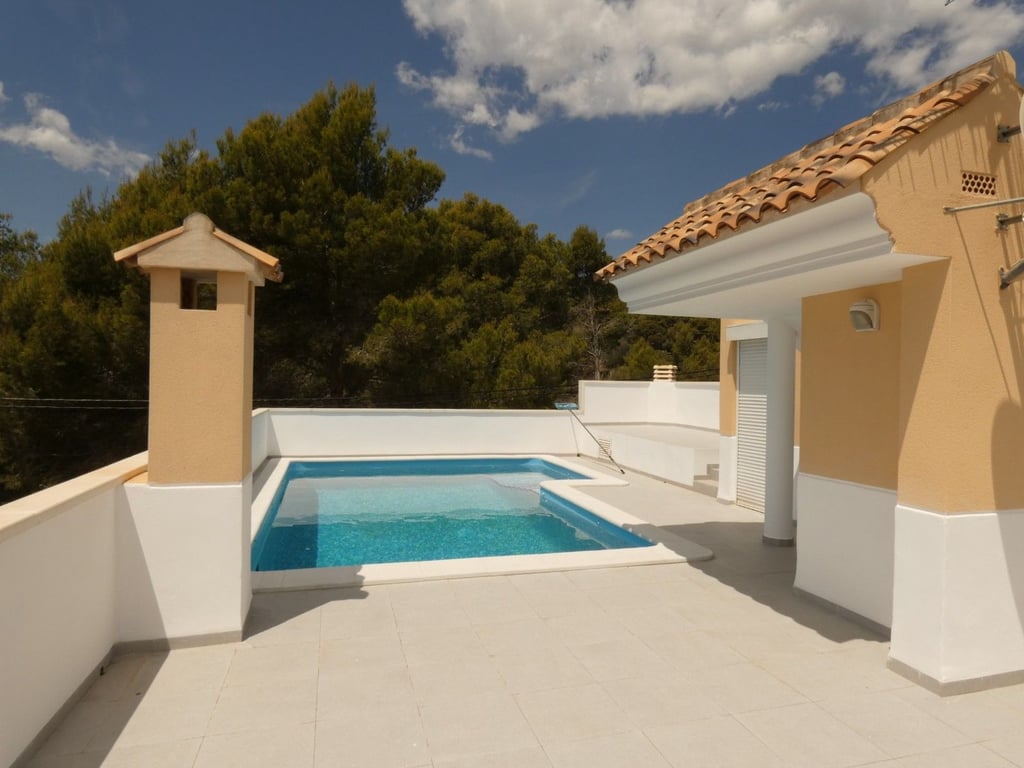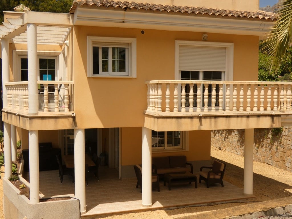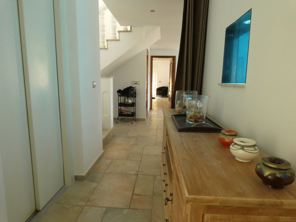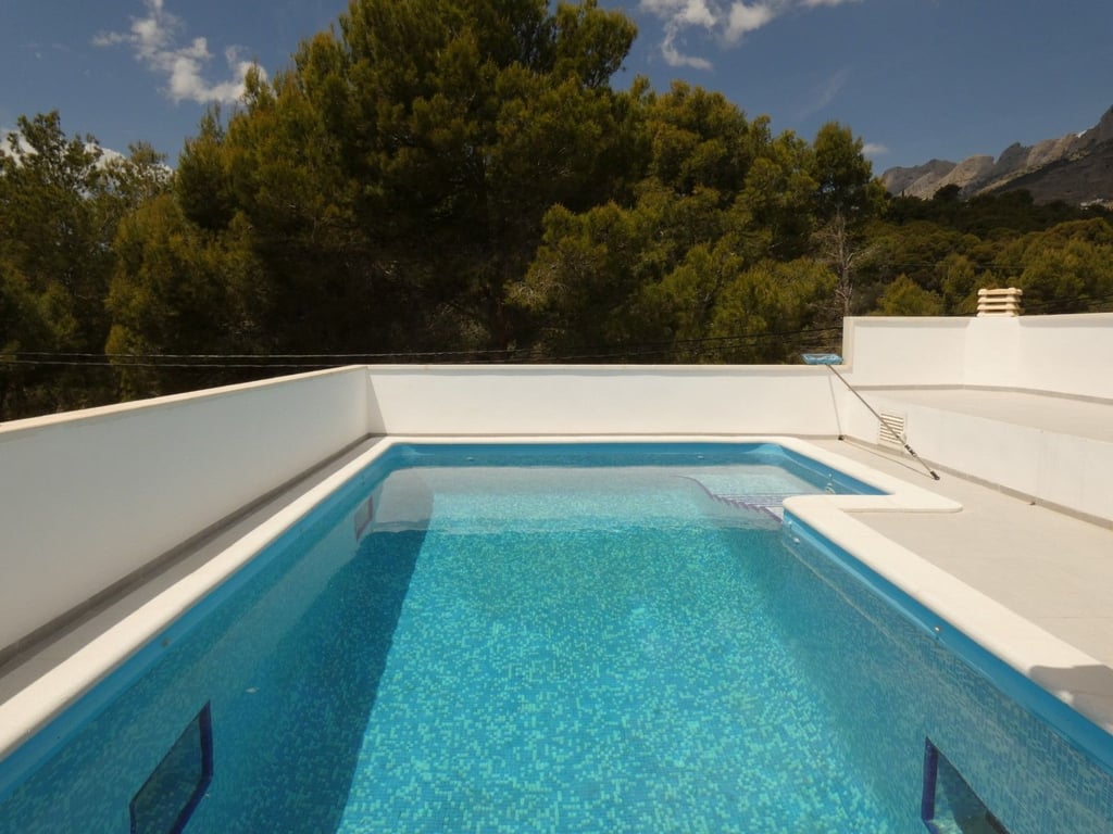 Deze villa van 216 m2 is gebouwd op een perceel van 900 m2. Deze villa heeft een verrassende indeling en er is een lift vanuit de garage naar het dakterras.De entree bevindt zich op de eerste verdieping. Hier vindt u een woonkamer, 2 slaapkamers met een gedeelde badkamer en een zeer ruim overdekt buitenterras, grenzend aan de tuin. Deze ruimte kan met kleine aanpassingen worden verbouwd tot gastenverblijf. Vanuit de hal is er een trap naar de 2e verdieping, waar zich de eigenlijke woonkamer bevindt, met open keuken, hoofdslaapkamer met badkamer en een balkonterras. Er is ook een apart gastentoilet.In de hal en de woonkamer zijn dikke ramen met uitzicht op het zwembad onder water. Dit geeft een speels en kleurrijk effect in de woonkamer door de schittering van de zon of de lichten van het zwembad. Het dakterras is een ruim sollarium, waar zich het zwembad bevindt en een aparte hoek met aansluitmogelijkheden voor een jaccuzi.Op de begane grond bevindt zich een zeer ruime garage onder het gehele huisgedeelte. Er is ruimte voor 4 tot 5 auto's. Deze villa ligt op loopafstand van het strand van Altea, met enkele leuke bars en restaurants in de buurt, slechts 2 km van het centrum van Altea en 68 km van de luchthaven van Alicante.