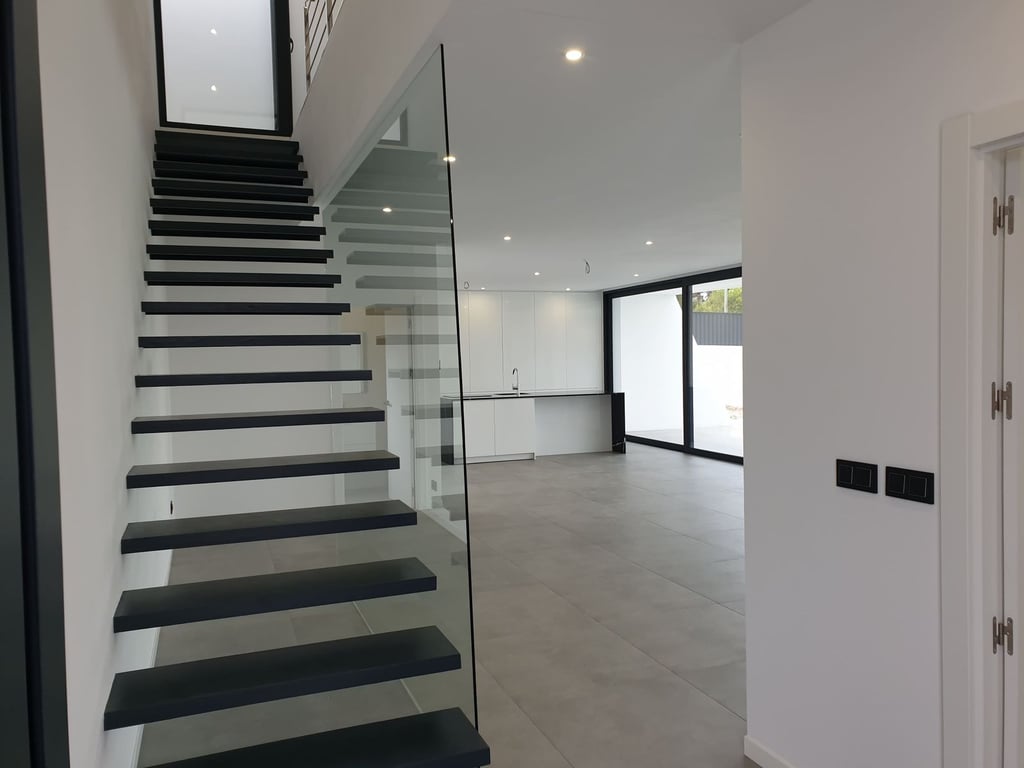 De bovenverdieping bestaat uit 3 slaapkamers met en-suite badkamers en toegang tot een zonnig terras. De villa is uitgerust met vloerverwarming, een gekanaliseerd airconditioningsysteem en groot formaat porseleinen vloertegels. Het heeft een overdekte parkeerplaats van 33,35m2.