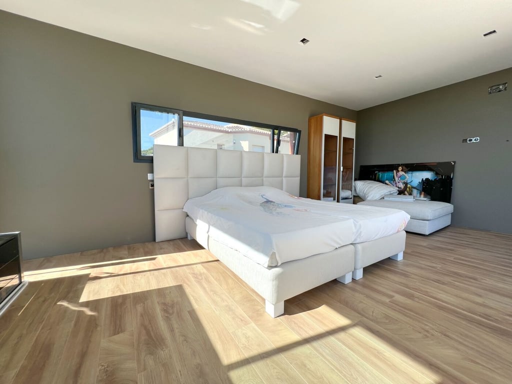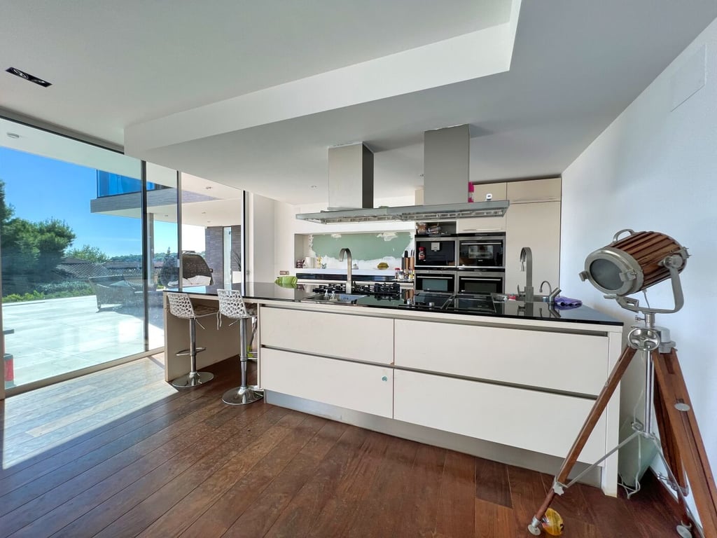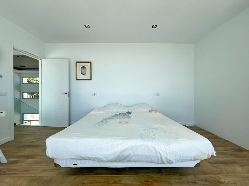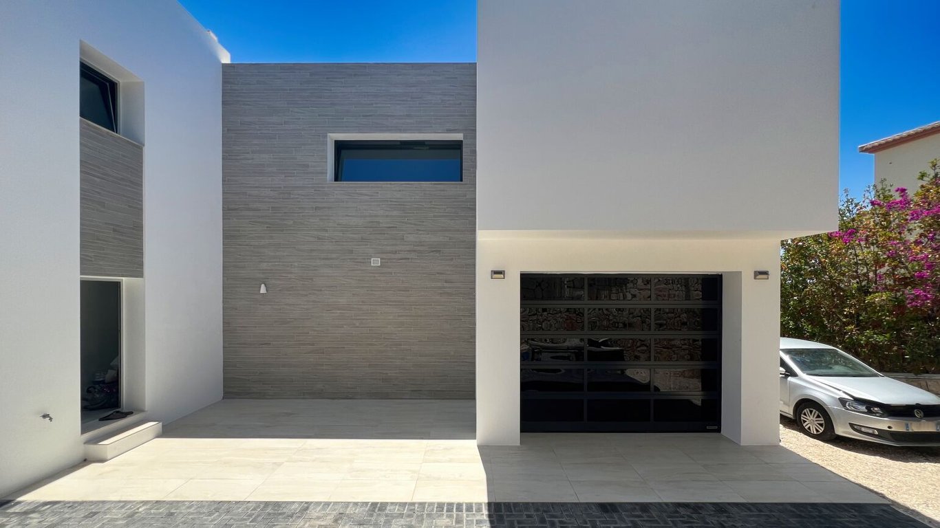 Bij de ingang van het pand vinden we een enkele garage waar we komen via een lange privé oprit met een draaicirkel. Zodra we de villa binnengaan, bevinden we ons op de hoofdverdieping die bestaat uit een ruime woon/eetkamer met een volledig ingerichte keuken aan de rechterkant en de eerste twee tweepersoonsslaapkamers en de familiebadkamer aan de linkerkant. Via de interne trap komen we op de eerste verdieping met een ouderslaapkamer, met panoramische ramen en een eigen badkamer, en nog eens drie tweepersoonsslaapkamers en twee badkamers. De woning is reeds voorzien van vloerverwarming en airconditioning.