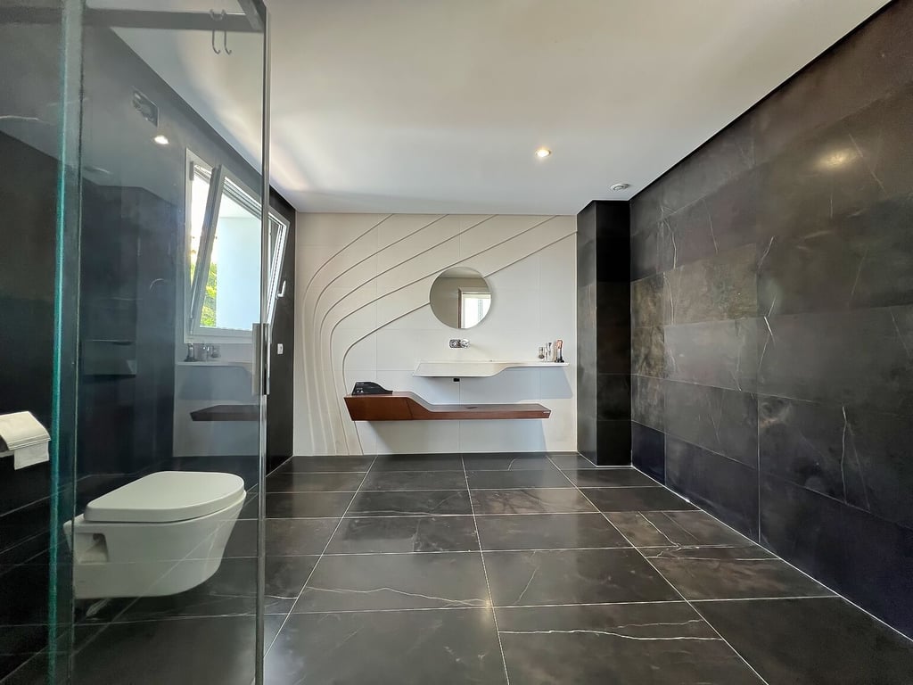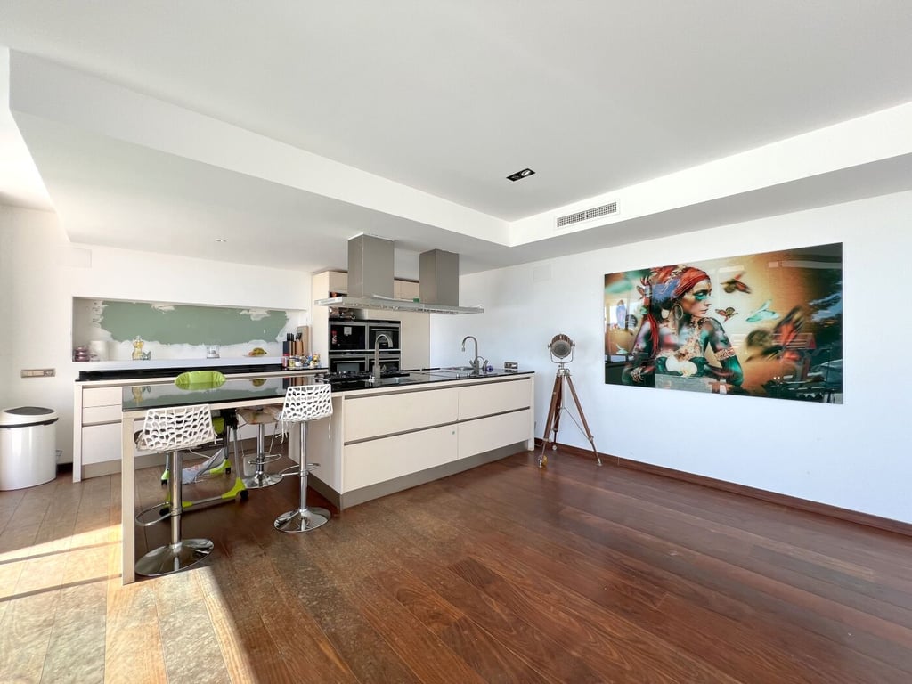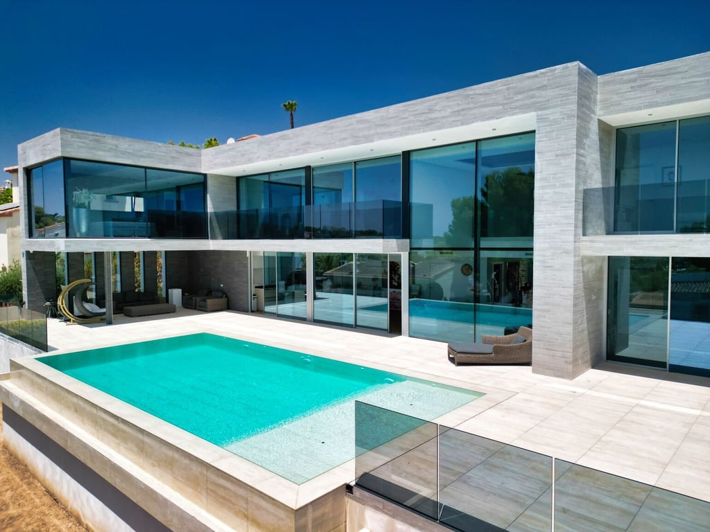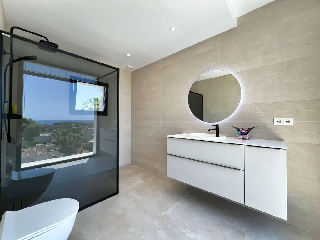 Bij de ingang van het pand vinden we een enkele garage waar we komen via een lange privé oprit met een draaicirkel. Zodra we de villa binnengaan, bevinden we ons op de hoofdverdieping die bestaat uit een ruime woon/eetkamer met een volledig ingerichte keuken aan de rechterkant en de eerste twee tweepersoonsslaapkamers en de familiebadkamer aan de linkerkant. Via de interne trap komen we op de eerste verdieping met een ouderslaapkamer, met panoramische ramen en een eigen badkamer, en nog eens drie tweepersoonsslaapkamers en twee badkamers. De woning is reeds voorzien van vloerverwarming en airconditioning.