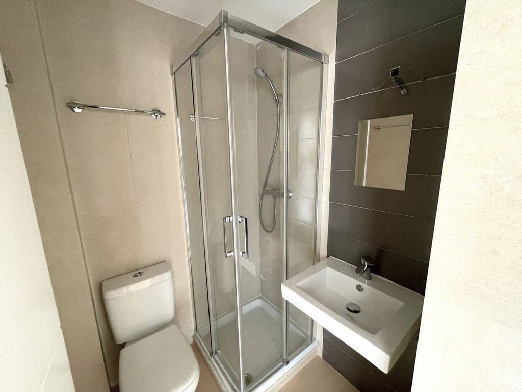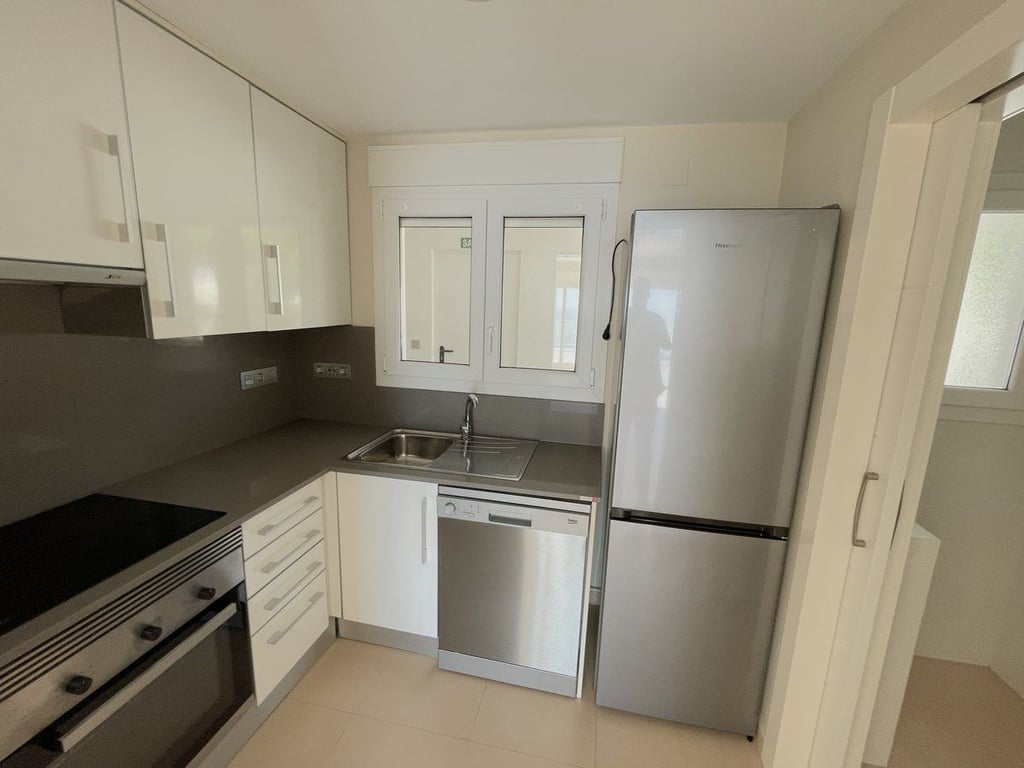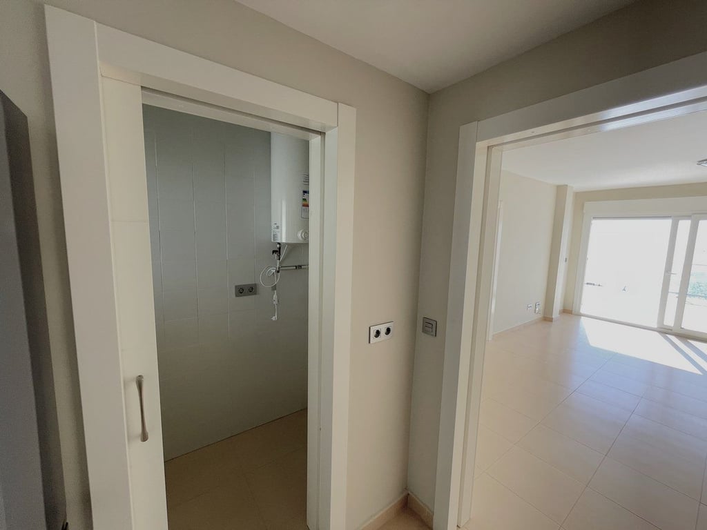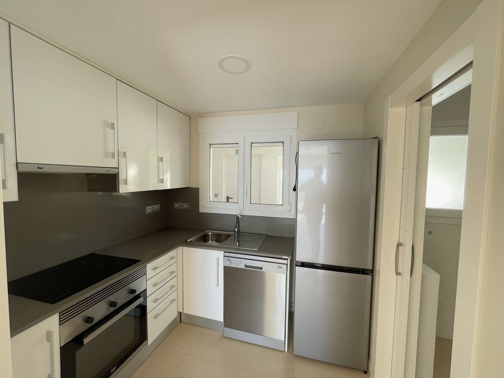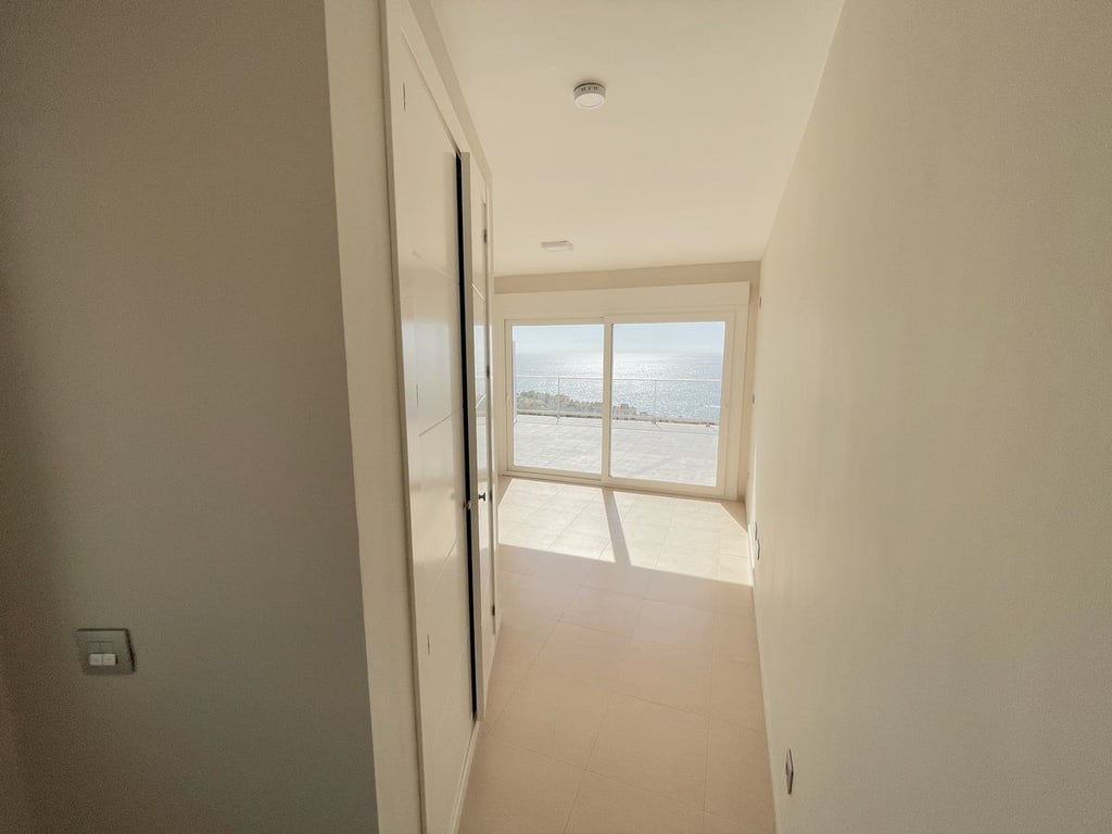 Upon entering the residence, you are greeted by an entrance hall that welcomes you into a beautiful dining and living room with direct access to the terrace, allowing you to enjoy the sea views at any time of the day. The kitchen, which is fully furnished and equipped, comes with a gallery that adds convenience and functionality to your daily life.