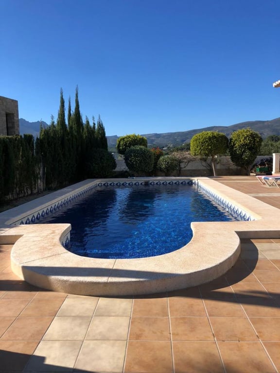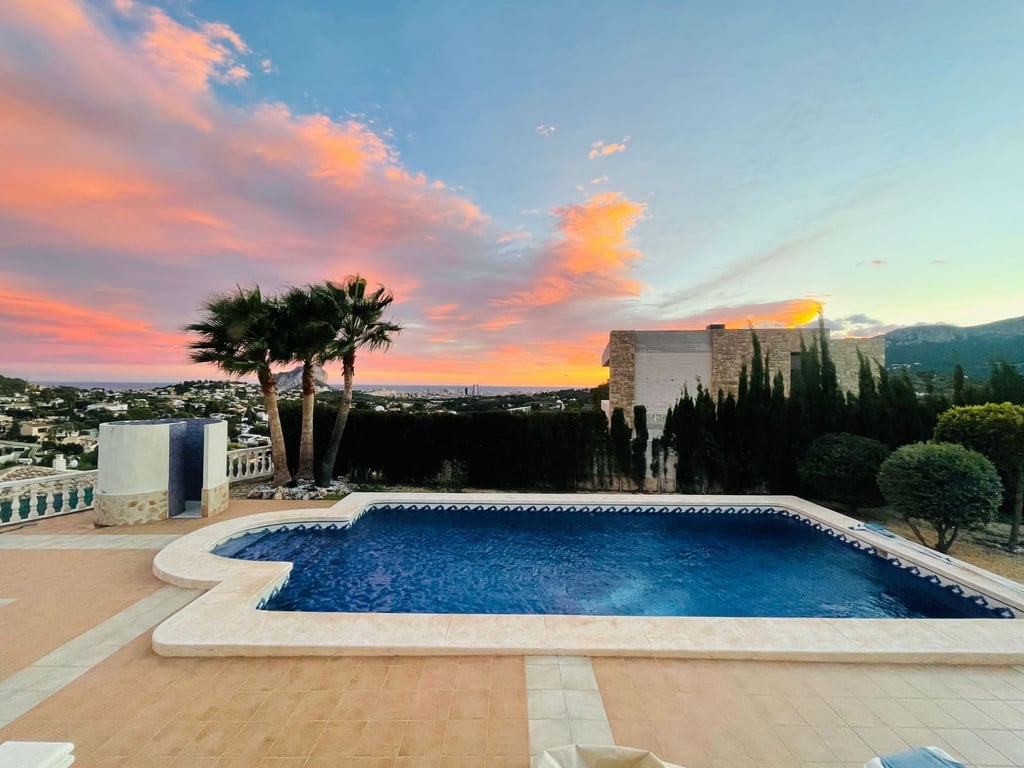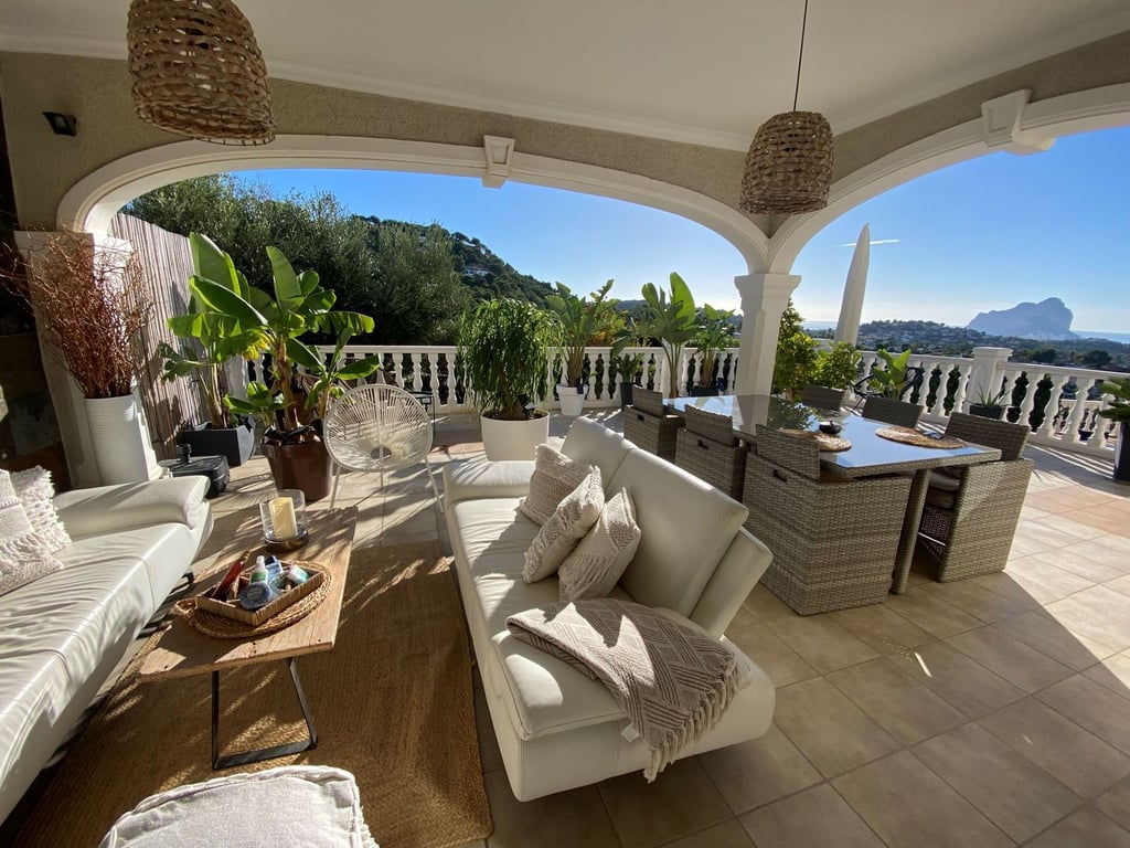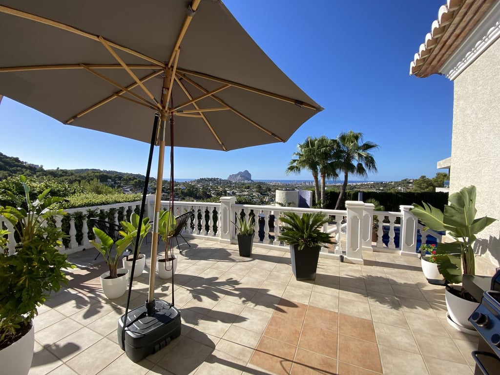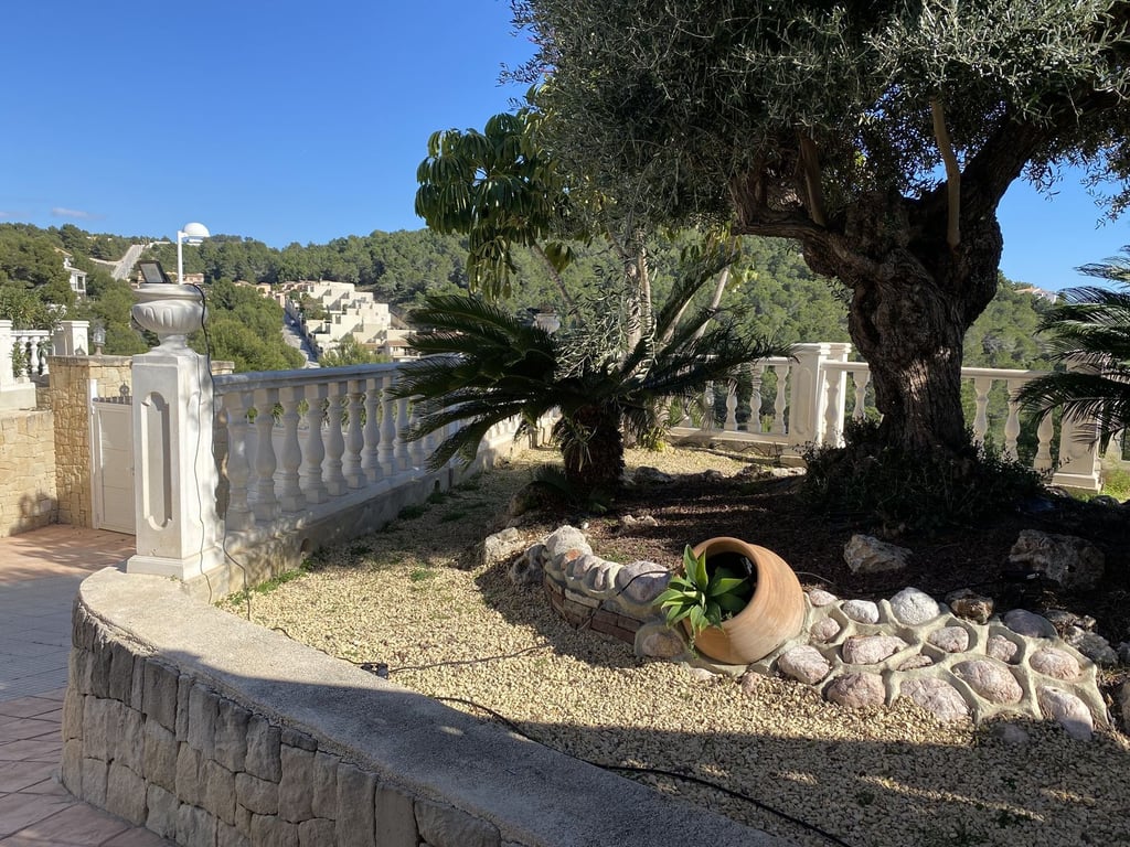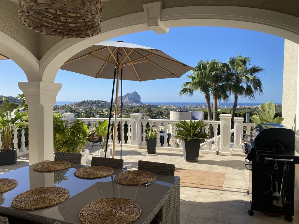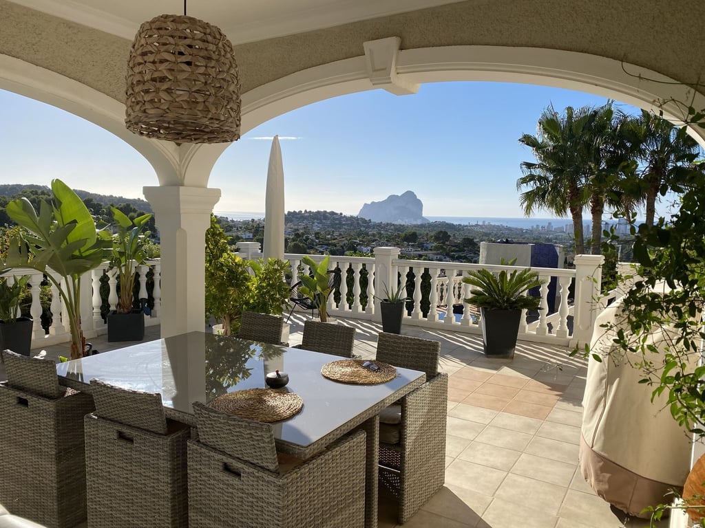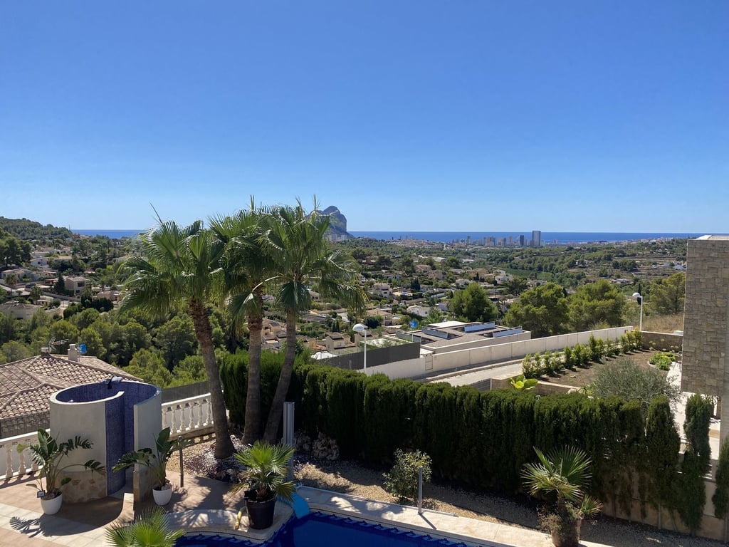 Villa in een van de beste urbanisaties in Calpe op een vlak perceel met een grote tuin en 360 graden uitzicht op het bos, uitzicht op zee, Peñón de Ifach en uitzicht op de bergen. Het heeft 2 verdiepingen en 5 grote slaapkamers met uitzicht op zee en 4 badkamers. Grote woonkamer, keuken, berging, garage. Woonoppervlakte van 280,46 m². Perceel: vlak 1000 m². Grote terrassen bij het zwembad van 11 x 4,50 met een buitendouche en 3 grote terrassen op het dak. Centrale verwarming Airconditioning Veel grote inbouwkasten Horren en automatische zonwering op alle ramen en deuren. Zeer privé en duidelijk zicht.