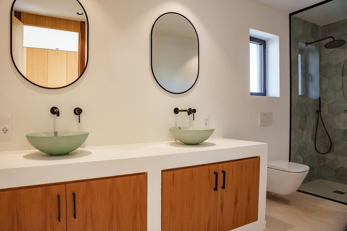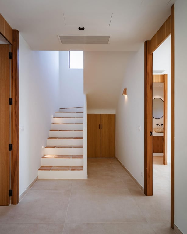 A generous bedroom with an en-suite bathroom and built-in wardrobes also opens up to the pool terrace. Additional amenities on this level include a guest toilet, utility room, and a garage for added convenience. Upstairs there are two more bedrooms, each with its own en-suite bathroom and build inwardrobes. Both bedrooms feature access to large terraces, offering excellent seaviews.