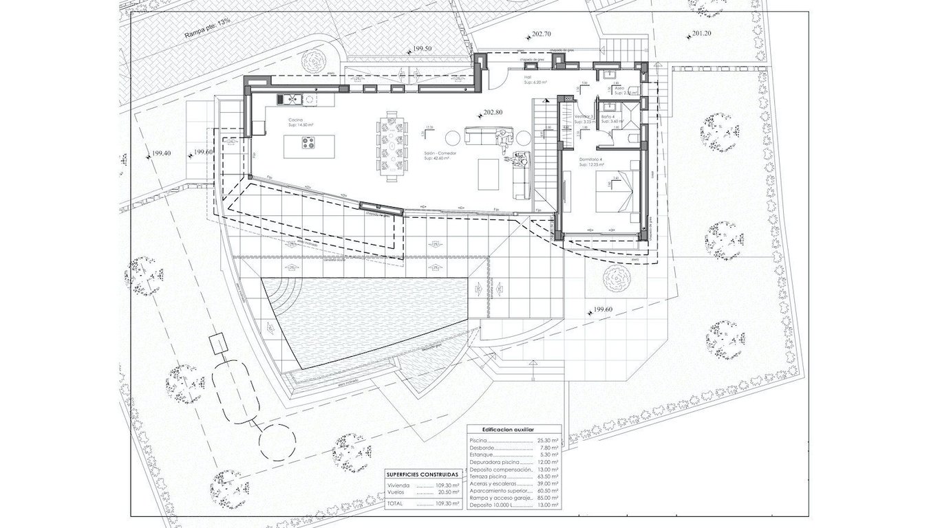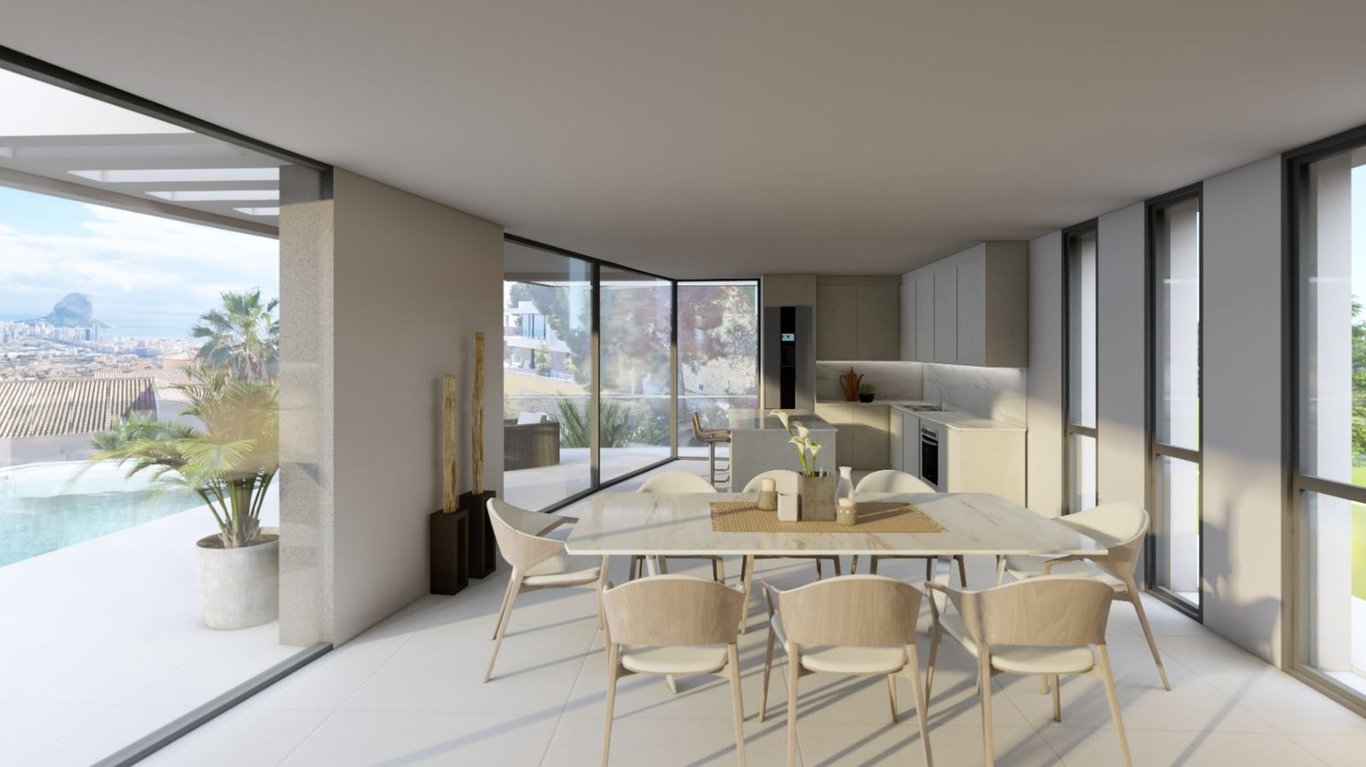 Deze luxe, ultramoderne villa met vier slaapkamers ligt op een heuvel net buiten de stad en biedt een prachtig panoramisch uitzicht op de Middellandse Zee en de Peñón de Ifach. Bij binnenkomst leidt de bovenste hal naar een grote geïntegreerde keuken met eetruimte. Glazen schuifdeuren openen naar een spectaculair terras met een overloopzwembad, vanwaar u kunt genieten van een prachtig uitzicht op de zee. Op hetzelfde niveau is er een slaapkamer met een en-suite badkamer, ingebouwde kasten en toegang tot het terras, evenals een gastentoilet gunstig gelegen nabij de inkomhal. Het lagere niveau herbergt een garage voor twee auto s met directe toegang tot het huis. Hier bevindt zich de hoofdslaapkamer, die beschikt over een U-vormige kleedruimte, ingebouwde kasten, een grote en-suite badkamer en een eigen patio. Een andere slaapkamer met en-suite badkamer biedt toegang tot het terras, aangevuld met een derde slaapkamer ook met toegang tot het terras, inbouwkasten en een extra familiebadkamer. De villa wordt instapklaar opgeleverd inclusief luxe extra s zoals hoogwaardige inbouwapparatuur van Siemens en Bosch, antislip tegels rondom het zwembad, Silestone werkbladen in de keuken, automatische deuren, alarm- en toegangssysteem, volledig ommuurd perceel, muskietennetten, warm/koud airconditioning, vloerverwarming via warmtepomp, elektrische zonwering en meer. Gelegen in de provincie Alicante, aan de noordelijke Costa Blanca, profiteert Calpe van de nabijheid van drie internationale luchthavens op minder dan twee uur rijden met de auto. Daarnaast beschikt het over hogesnelheidstreinen en eersteklas snelwegen die de gemeenschap met grote steden verbinden. Voor strandliefhebbers hebben de nieuwe eigenaren verschillende opties binnen 15 minuten rijden, waaronder ten minste drie stranden die zijn bekroond met de Blauwe Vlag, een symbool van kwaliteit en netheid.