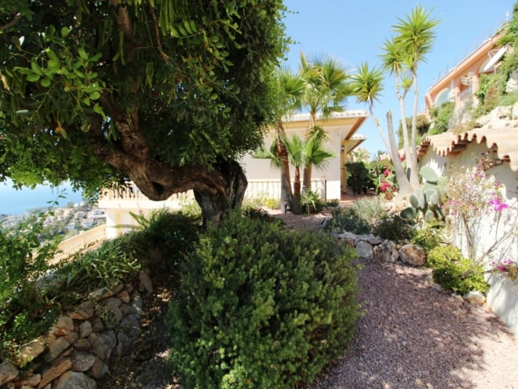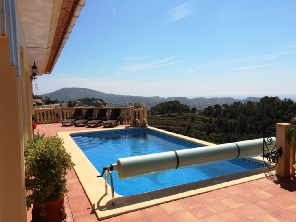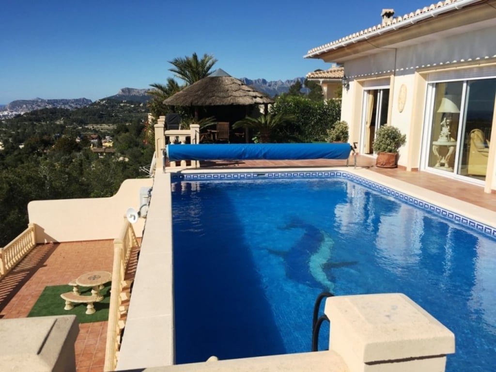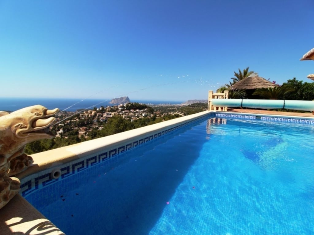 Panoramic Villa with stunning sea views for sale in Benimeit, 4.5 km drive to the town of Teulada and 5 km to the Blue flag sandy beaches of Moraira. Built-in 2004 comprises of one main level with spectacular views of the sea and Penon de Ifach. Entry via a driveway leading to the double garage. On the upper lane a Pedestrian gate to the main door or via the internal staircase from the garage. Entry via the main door into the spacious open plan Lounge and Dining area, with large sliding doors with views over the pool to the sea. Open plan kitchen with central Island and granite worktops, fully fitted with appliances, double oven and sliding doors to the pool terrace. Underfloor Central heating on this level together with Air conditioning in all bedrooms. The double glazing windows have electric blinds. Doors from the Kitchen and Lounge flow onto the newly laid terrace with non-slip natural stone tiles, designed to collect any surface water and diverts to a large water deposit and diverted and used in the garden via a timed irrigation system. Master bedroom with His & Hers fitted wardrobes in the walk-in closet area, sliding doors flowing out to the terrace. En-suite bathroom with corner bath and walk-in shower, double vanity unit, WC. Further two bedrooms with fitted wardrobes sharing a shower room. Internal staircase to lower level with an independent 1 bedroom, sea view guest apartment with en-suite shower room, full kitchen access from the garage or independent front door. Outside on the 785m2 plot, the terrace has an open Naya, 8 x 4m2 infinity swimming pool, Portable BBQ area and a shady Gazebo. Established and manageable garden with flower, Mediterranean plants and fruit trees. There is also a lower terrace leading from the guest apartment. Extras include a high-tech video surveillance system with cameras that can be accessed via your mobile device anywhere in the world. Wall mounted solar heating system for hot water and heating the pool, New water pressure of 4 ¼ bar, new costs effective heating system, cutting yearly flue bills. Wifi throughout the property.