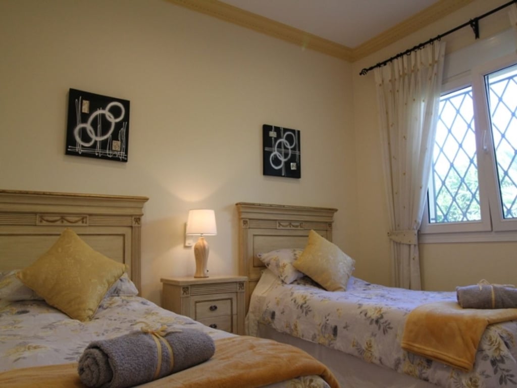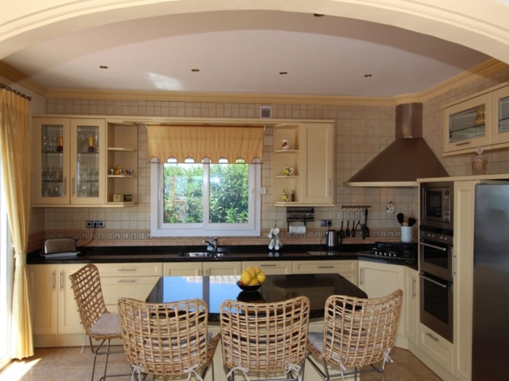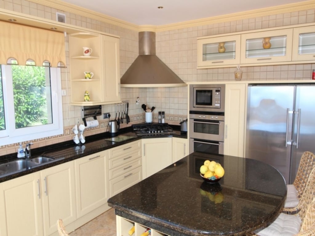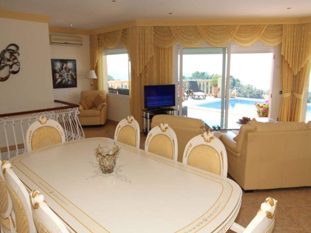 Panoramic Villa with stunning sea views for sale in Benimeit, 4.5 km drive to the town of Teulada and 5 km to the Blue flag sandy beaches of Moraira. Built-in 2004 comprises of one main level with spectacular views of the sea and Penon de Ifach. Entry via a driveway leading to the double garage. On the upper lane a Pedestrian gate to the main door or via the internal staircase from the garage. Entry via the main door into the spacious open plan Lounge and Dining area, with large sliding doors with views over the pool to the sea. Open plan kitchen with central Island and granite worktops, fully fitted with appliances, double oven and sliding doors to the pool terrace. Underfloor Central heating on this level together with Air conditioning in all bedrooms. The double glazing windows have electric blinds. Doors from the Kitchen and Lounge flow onto the newly laid terrace with non-slip natural stone tiles, designed to collect any surface water and diverts to a large water deposit and diverted and used in the garden via a timed irrigation system. Master bedroom with His & Hers fitted wardrobes in the walk-in closet area, sliding doors flowing out to the terrace. En-suite bathroom with corner bath and walk-in shower, double vanity unit, WC. Further two bedrooms with fitted wardrobes sharing a shower room. Internal staircase to lower level with an independent 1 bedroom, sea view guest apartment with en-suite shower room, full kitchen access from the garage or independent front door. Outside on the 785m2 plot, the terrace has an open Naya, 8 x 4m2 infinity swimming pool, Portable BBQ area and a shady Gazebo. Established and manageable garden with flower, Mediterranean plants and fruit trees. There is also a lower terrace leading from the guest apartment. Extras include a high-tech video surveillance system with cameras that can be accessed via your mobile device anywhere in the world. Wall mounted solar heating system for hot water and heating the pool, New water pressure of 4 ¼ bar, new costs effective heating system, cutting yearly flue bills. Wifi throughout the property.