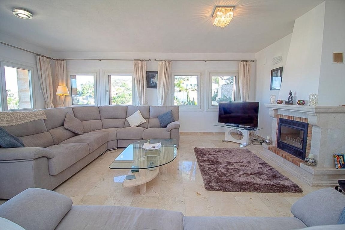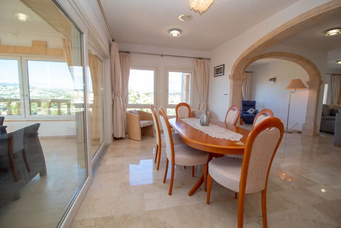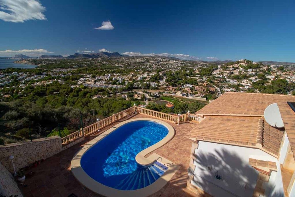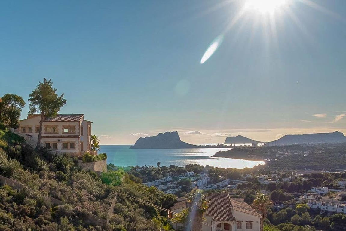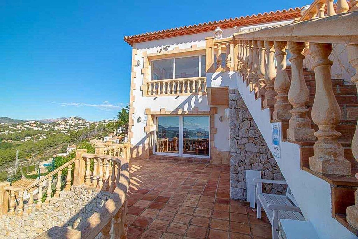 This magnificent Sea View Villa is located in the sought after area of El Portet, Moraira and must be seen to be appreciated.  With an impressive entrance through the electric driveway door, a long driveway leads down to the parking area and double garage.  The main villa can be accessed from here either by a few external steps or by lift.  Outside the front door is a Courtyard. Upon entering the villa, there is an exceptionally spacious hallway, with Guest WC and a workshop which could be used as an office / Cloakroom.  Double doors open into a large open plan lounge / dining room with feature log burning fireplace with Tosca stone arches, panoramic windows on all sides, allowing fantastic views to the sea, valley and Calpe Rock. There is an additional glazed room leading from the dining area boasting spectacular views and sunsets all year round.  Leading from the dining room is a fully fitted modern kitchen with, electric oven, halogen hob, American fridge freezer, dishwasher and plenty of cupboard space.  Sliding patio doors then lead out onto the large pool terrace with well maintained 9m x 5m kidney shaped pool.  From the main hallway, a wide sweeping staircase leads down to another large hallway, where there is a Master bedroom with direct access to outside and an en-suite full bathroom. There is a good size second bedroom and another room also used as a double bedroom. A separate family bathroom facilities these bedrooms. Plenty of built in storage features throughout this level. The Villa has marble floors, underfloor heading, and air conditioning in bedrooms.  In addition to the main house, is a separate apartment with kitchenette next to the pool terrace. There is also a utility room and a shower and toilet for the pool area .  The property has an alarm / security system with CCTV cameras which can connect to mobile phone.  With easy to maintain Mediterranean gardens surrounding the villa, including Palm and fruit trees, it is a relaxing place to be.