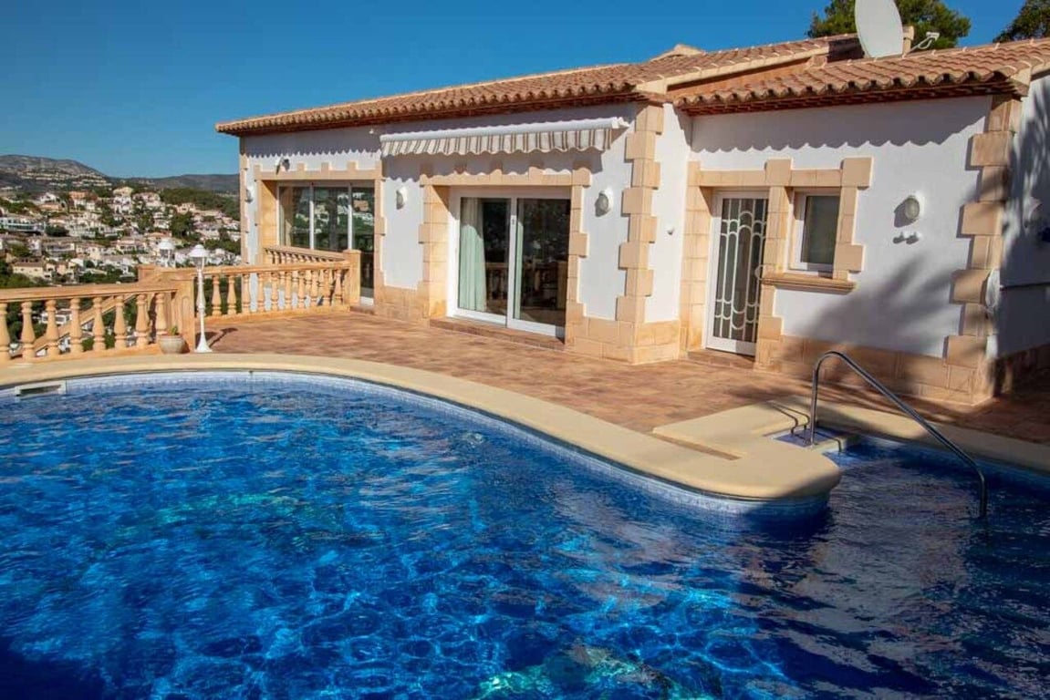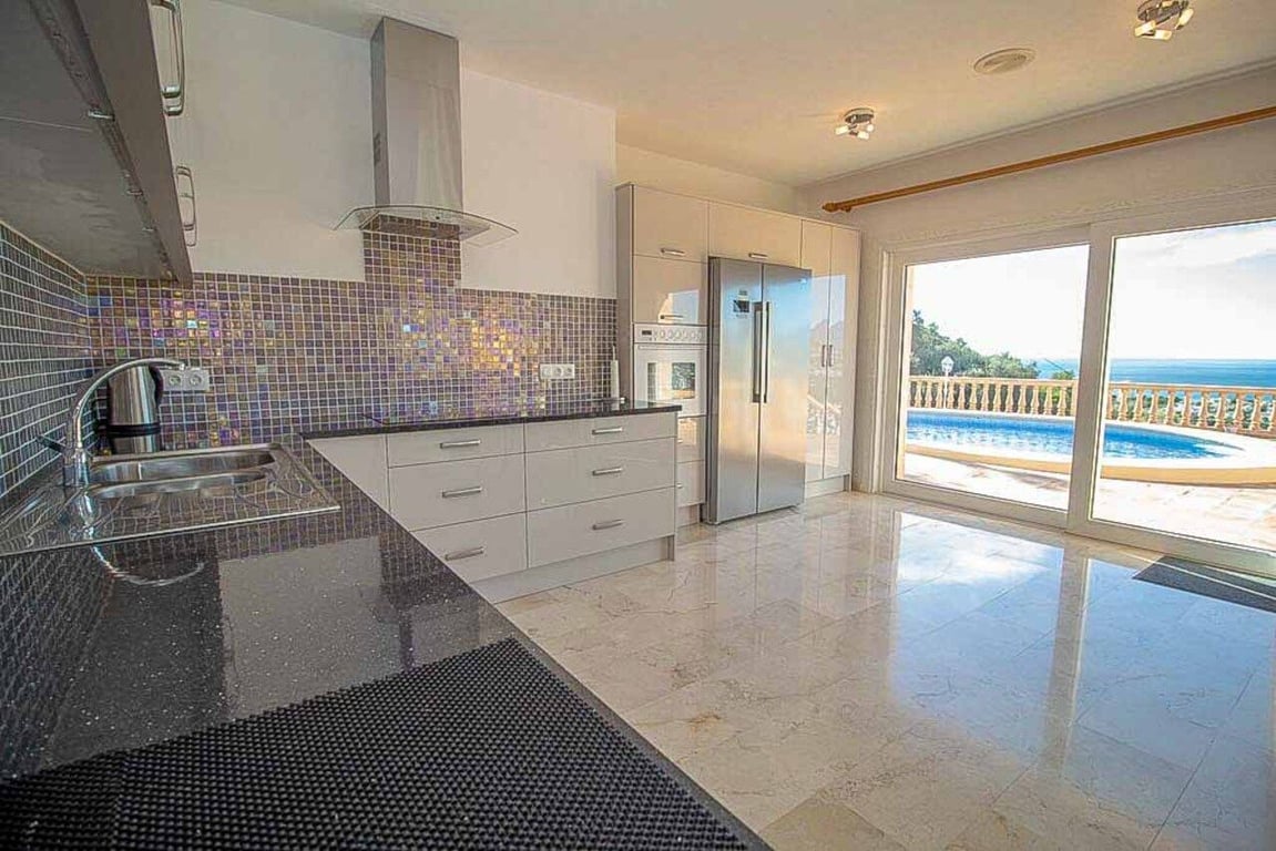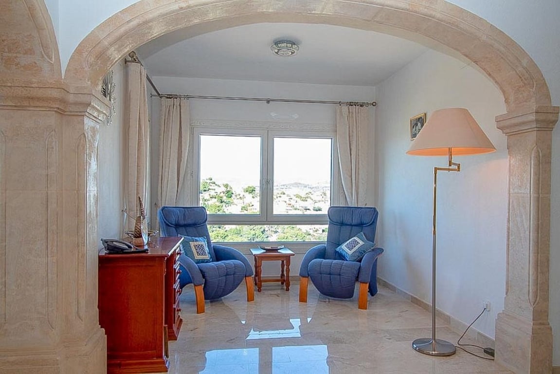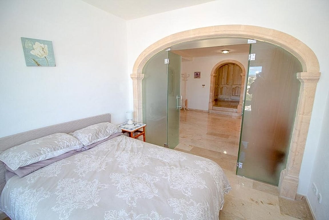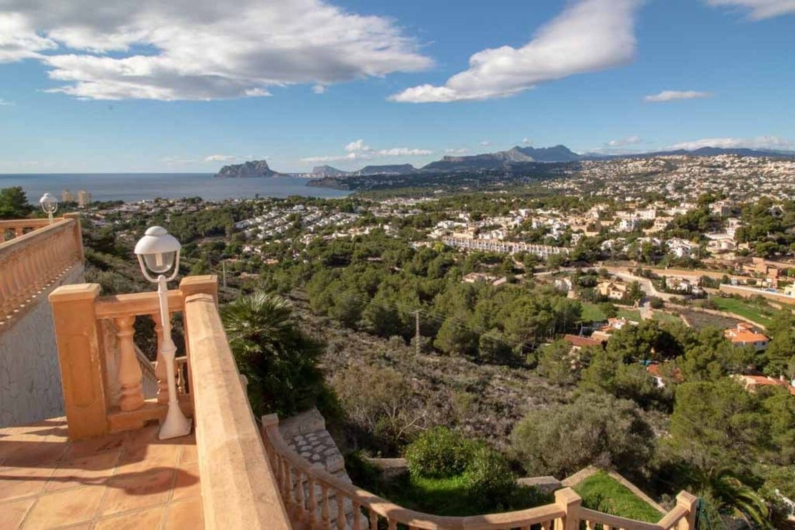 This magnificent Sea View Villa is located in the sought after area of El Portet, Moraira and must be seen to be appreciated.  With an impressive entrance through the electric driveway door, a long driveway leads down to the parking area and double garage.  The main villa can be accessed from here either by a few external steps or by lift.  Outside the front door is a Courtyard. Upon entering the villa, there is an exceptionally spacious hallway, with Guest WC and a workshop which could be used as an office / Cloakroom.  Double doors open into a large open plan lounge / dining room with feature log burning fireplace with Tosca stone arches, panoramic windows on all sides, allowing fantastic views to the sea, valley and Calpe Rock. There is an additional glazed room leading from the dining area boasting spectacular views and sunsets all year round.  Leading from the dining room is a fully fitted modern kitchen with, electric oven, halogen hob, American fridge freezer, dishwasher and plenty of cupboard space.  Sliding patio doors then lead out onto the large pool terrace with well maintained 9m x 5m kidney shaped pool.  From the main hallway, a wide sweeping staircase leads down to another large hallway, where there is a Master bedroom with direct access to outside and an en-suite full bathroom. There is a good size second bedroom and another room also used as a double bedroom. A separate family bathroom facilities these bedrooms. Plenty of built in storage features throughout this level. The Villa has marble floors, underfloor heading, and air conditioning in bedrooms.  In addition to the main house, is a separate apartment with kitchenette next to the pool terrace. There is also a utility room and a shower and toilet for the pool area .  The property has an alarm / security system with CCTV cameras which can connect to mobile phone.  With easy to maintain Mediterranean gardens surrounding the villa, including Palm and fruit trees, it is a relaxing place to be.