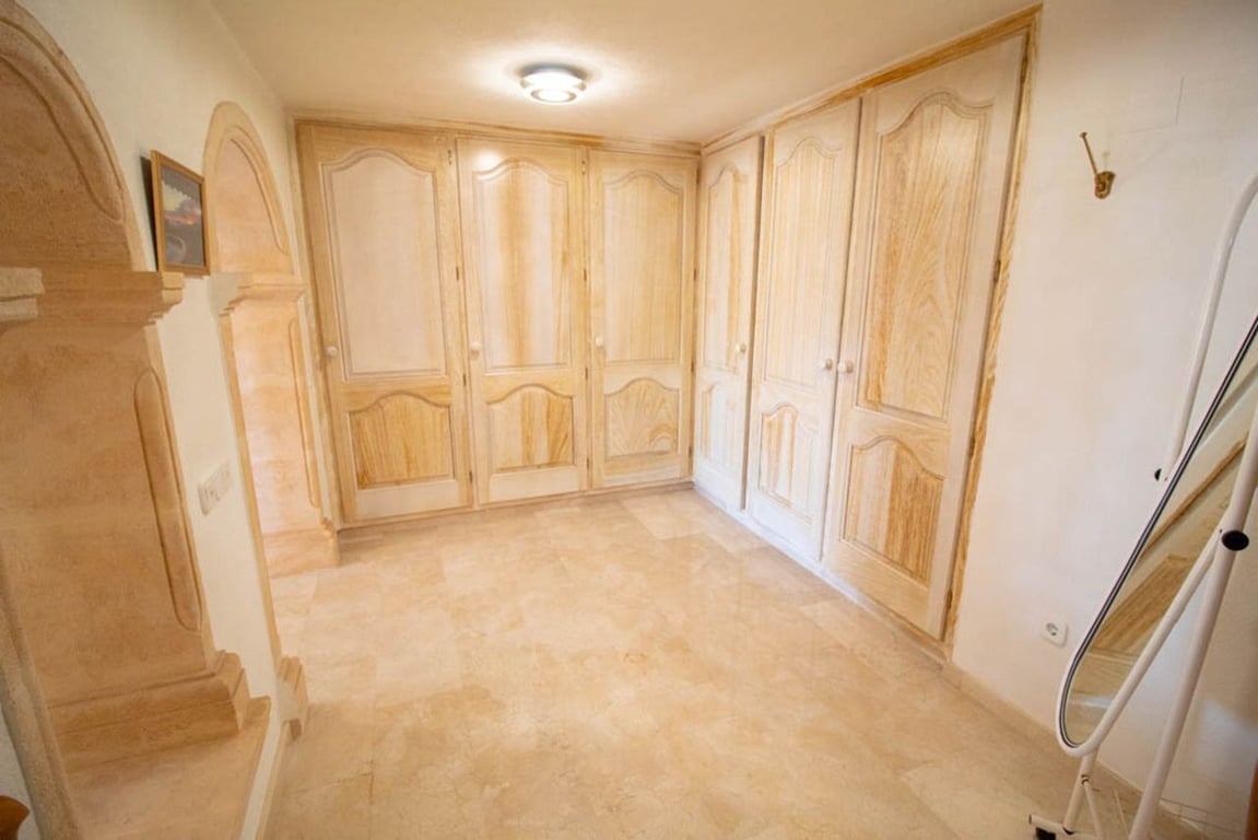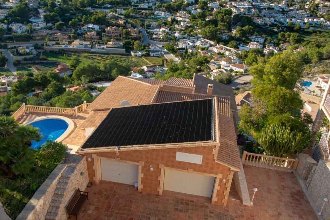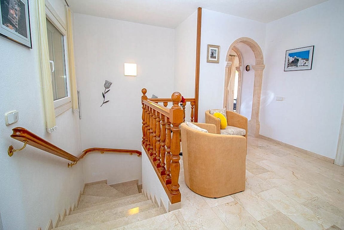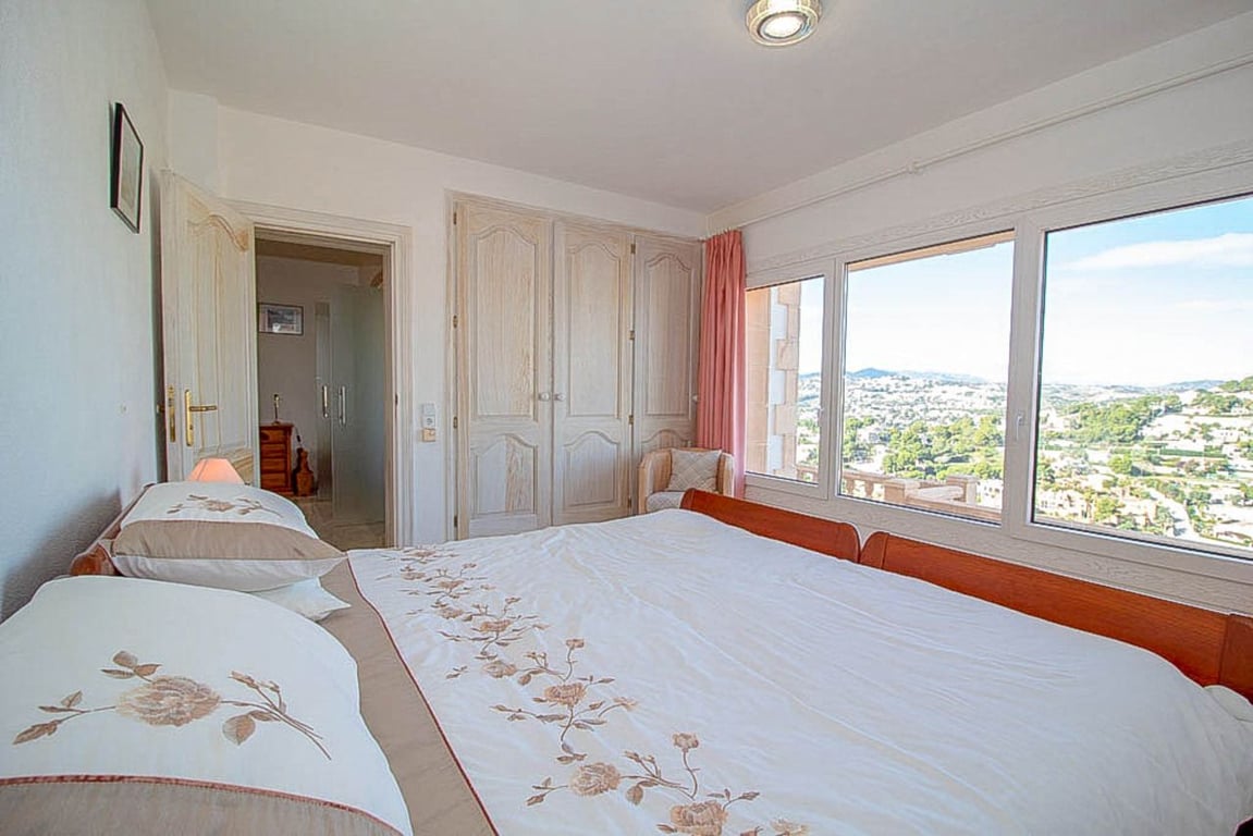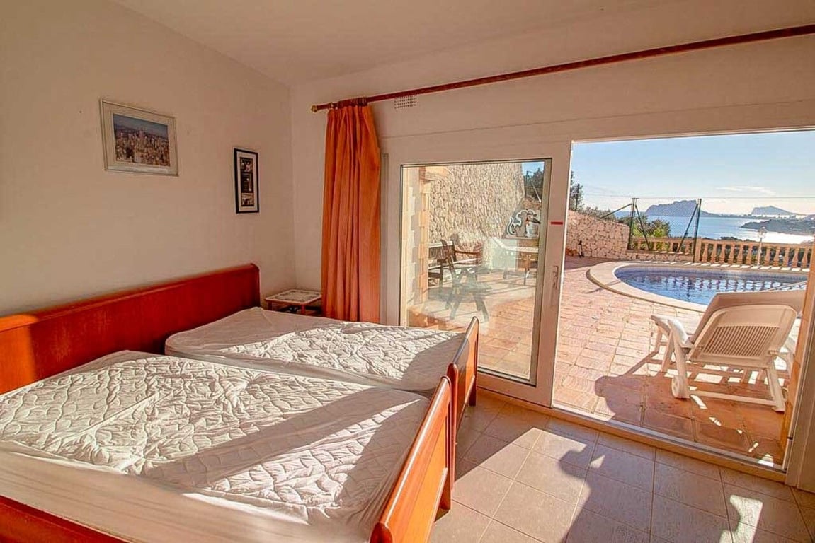 This magnificent Sea View Villa is located in the sought after area of El Portet, Moraira and must be seen to be appreciated.  With an impressive entrance through the electric driveway door, a long driveway leads down to the parking area and double garage.  The main villa can be accessed from here either by a few external steps or by lift.  Outside the front door is a Courtyard. Upon entering the villa, there is an exceptionally spacious hallway, with Guest WC and a workshop which could be used as an office / Cloakroom.  Double doors open into a large open plan lounge / dining room with feature log burning fireplace with Tosca stone arches, panoramic windows on all sides, allowing fantastic views to the sea, valley and Calpe Rock. There is an additional glazed room leading from the dining area boasting spectacular views and sunsets all year round.  Leading from the dining room is a fully fitted modern kitchen with, electric oven, halogen hob, American fridge freezer, dishwasher and plenty of cupboard space.  Sliding patio doors then lead out onto the large pool terrace with well maintained 9m x 5m kidney shaped pool.  From the main hallway, a wide sweeping staircase leads down to another large hallway, where there is a Master bedroom with direct access to outside and an en-suite full bathroom. There is a good size second bedroom and another room also used as a double bedroom. A separate family bathroom facilities these bedrooms. Plenty of built in storage features throughout this level. The Villa has marble floors, underfloor heading, and air conditioning in bedrooms.  In addition to the main house, is a separate apartment with kitchenette next to the pool terrace. There is also a utility room and a shower and toilet for the pool area .  The property has an alarm / security system with CCTV cameras which can connect to mobile phone.  With easy to maintain Mediterranean gardens surrounding the villa, including Palm and fruit trees, it is a relaxing place to be.