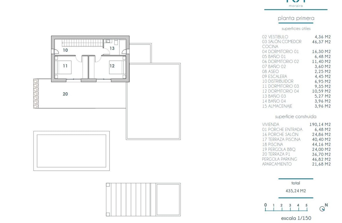 Nieuwbouw villa te koop in Moraira. Moderne woning met 4 slaapkamers, privézwembad en carport in Pinar de L'Advocat. Ideaal voor wonen of investeren aan de Costa Blanca. In een nieuwe ontwikkeling in Pinar de L'Advocat in Moraira wordt deze nog te bouwen moderne villa te koop aangeboden. De woning ligt op iets meer dan een kilometer van het centrum, met winkels, restaurants, jachthaven en strand. Beschrijving De woning krijgt twee verdiepingen en combineert strakke architectuur met natuurlijke materialen zoals natuursteen. Op de begane grond bevinden zich de ruime woon-eetkamer, een moderne keuken, gastentoilet en twee slaapkamers met en-suite badkamer. Via de interne trap bereikt u de bovenverdieping met nog twee slaapkamers, beide met toegang tot een privéterras en een gedeelde badkamer. Vanuit de salon en keuken is er directe toegang tot het overdekte terras en het zonneterras rond het zwembad van 40 m². Naast de pool ligt een pergola met barbecue, een berging en een vierde badkamer. De onderhoudsvrije tuin biedt privacy en rust. Er is een carport voor twee auto's. De villa wordt voorzien van pre-installatie voor vloerverwarming en alarm, airconditioning via kanalen, dubbel glas en een buitendouche. Bijzonderheden Villa te koop in MorairaNieuwbouw in Pinar de L'Advocat4 slaapkamers, 4 badkamersPrivézwembad van 40 m²Carport voor 2 auto'sOnderhoudsarme tuinWaarom deze villa bezichtigen Nabij centrum MorairaModerne indeling met veel lichtStrak design met natuurlijke materialenGoede bouwkwaliteitDeze villa is uitstekend geschikt voor jaarrond wonen of voor de verhuur. Interesse in dit project? Vraag ons om meer informatie!