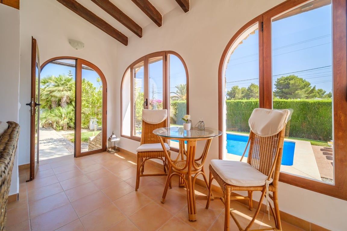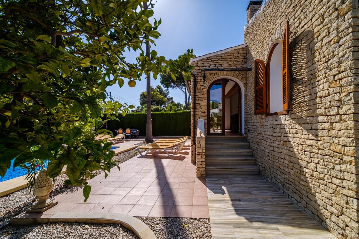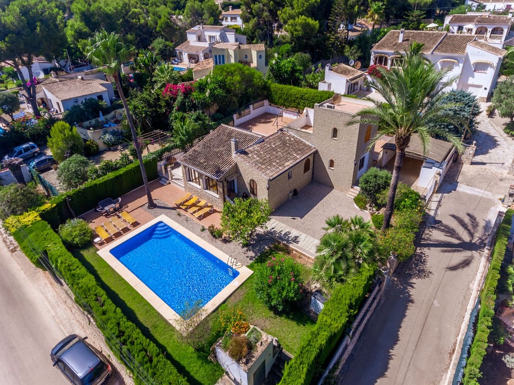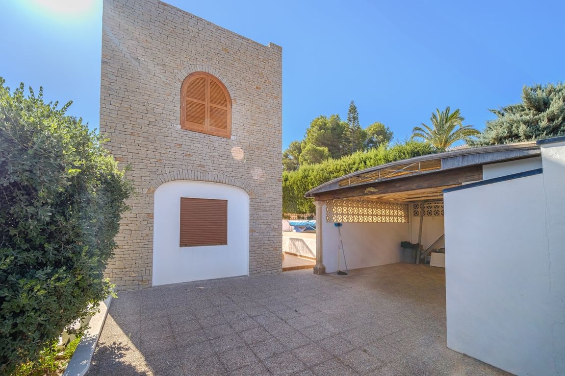 A dream villa is up for sale in Javea, located in the Costa Nova urbanization. This villa is in excellent condition both inside and out. The garden, with its large pool nestled in the center of the terrace, is well maintained and leaves nothing to be desired. Adjacent to the pool, there is a spacious area perfect for sunbathing. The villa comprises 6 bedrooms and 3 bathrooms. On the ground floor, there are 5 bedrooms and 2 bathrooms, while the first floor features an additional bedroom with a bathroom and kitchen. All bedrooms are equipped with built-in wardrobes and air conditioning. The ground floor boasts a sizable sitting area overlooking the pool. Adjacent to the living room is the kitchen, which has an additional exit leading to the outdoor.
