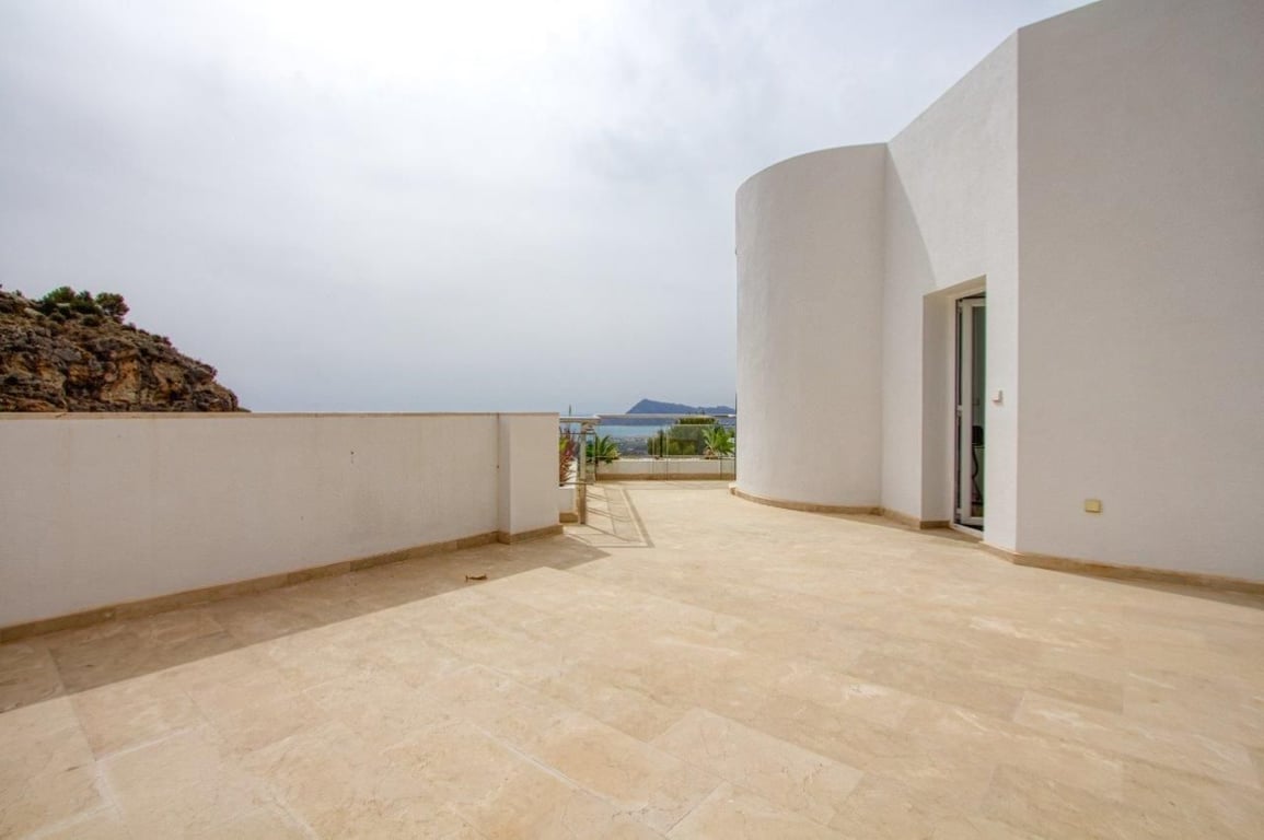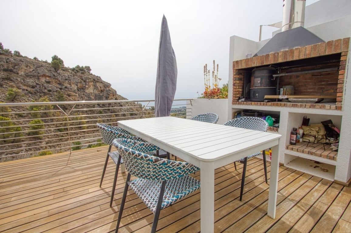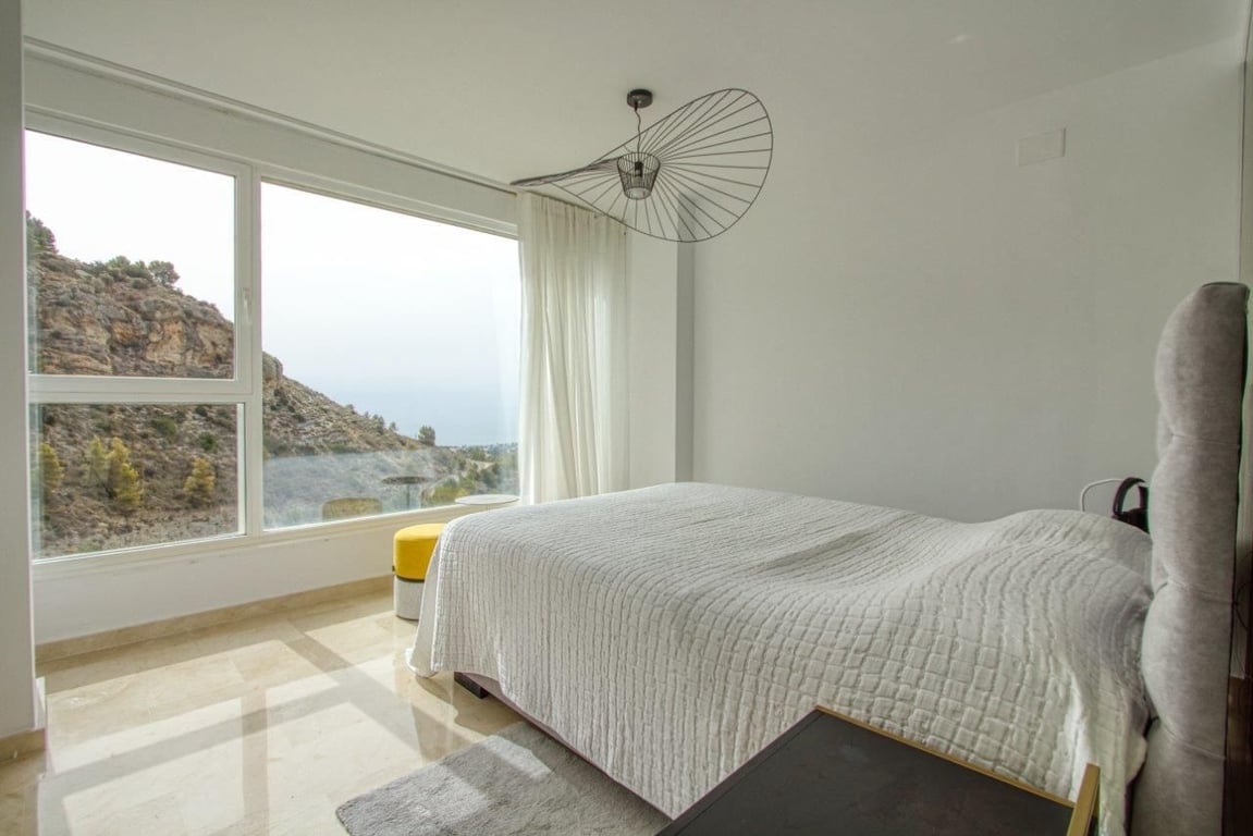 Fascinating villa in a private residential complex with views of the Mediterranean Sea and the Benidorm coast.The villa is situated on top of a mountain with a unique environment with private access only for residents, ensuring greater privacy and security. Just 15 minutes from the beach and 30 minutes from BenidormThe property has an entrance with a panoramic terrace, open-air, and a foyer with access to stairs and elevator.Descending to the first floor, we find the area designated for the living space, with a spacious living-dining room and integrated kitchen, with direct access to the terrace featuring a barbecue, pergola, and private swimming pool, offering unique views of the sea. It is a very bright and comfortable area with high-quality construction and is surrounded by large windows, providing an exceptional environment. The kitchen includes an island, integrated appliances, a separate laundry area, and a stylish bathroom to complete the space.On the lower floor, intended for the sleeping area, there are 3 bedrooms, each with a walk-in closet and a private bathroom.Independent area designated for machinery.The access to each floor can be done via the designer staircase or the private elevator within the property.The Villa has:heated cascade pool.air conditioning (HOT/COLD).natural gas heating.climalit windows, reinforced for security and insulation.garage with automatic door.barbecue area BARBECUE AREA.