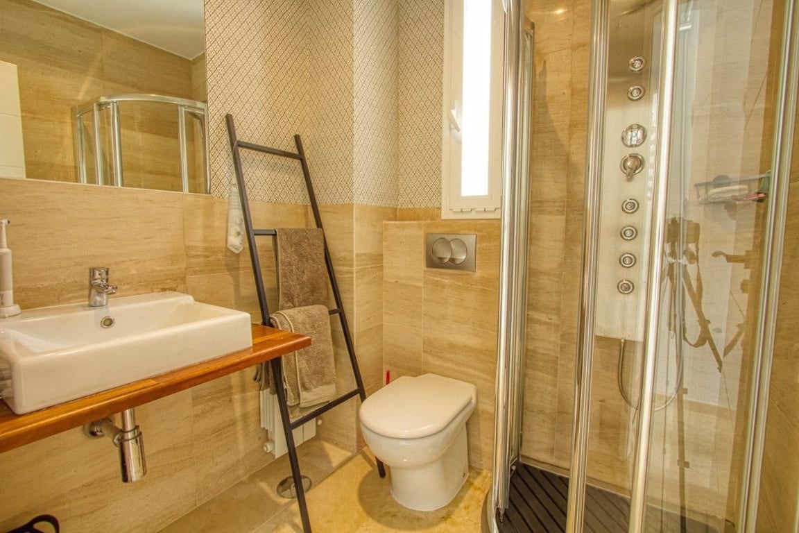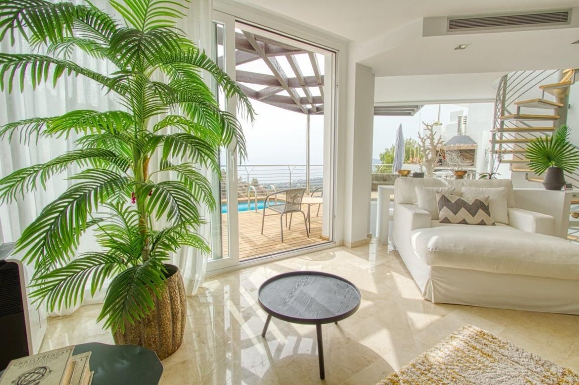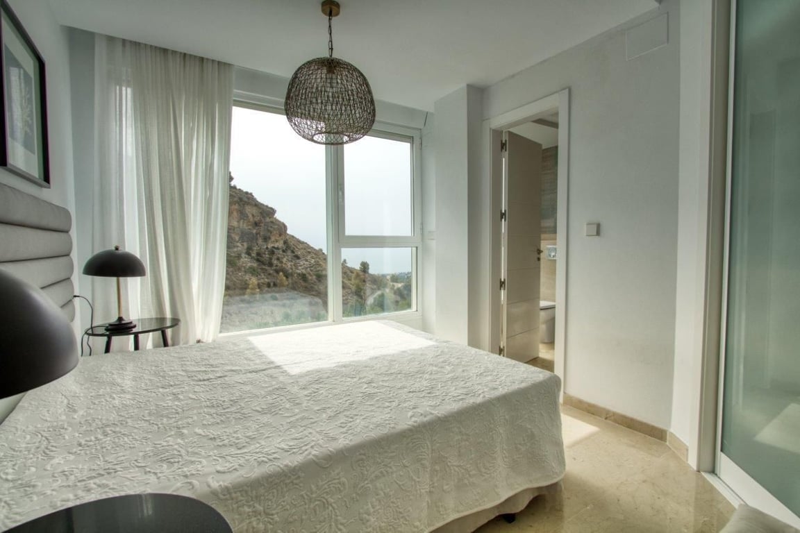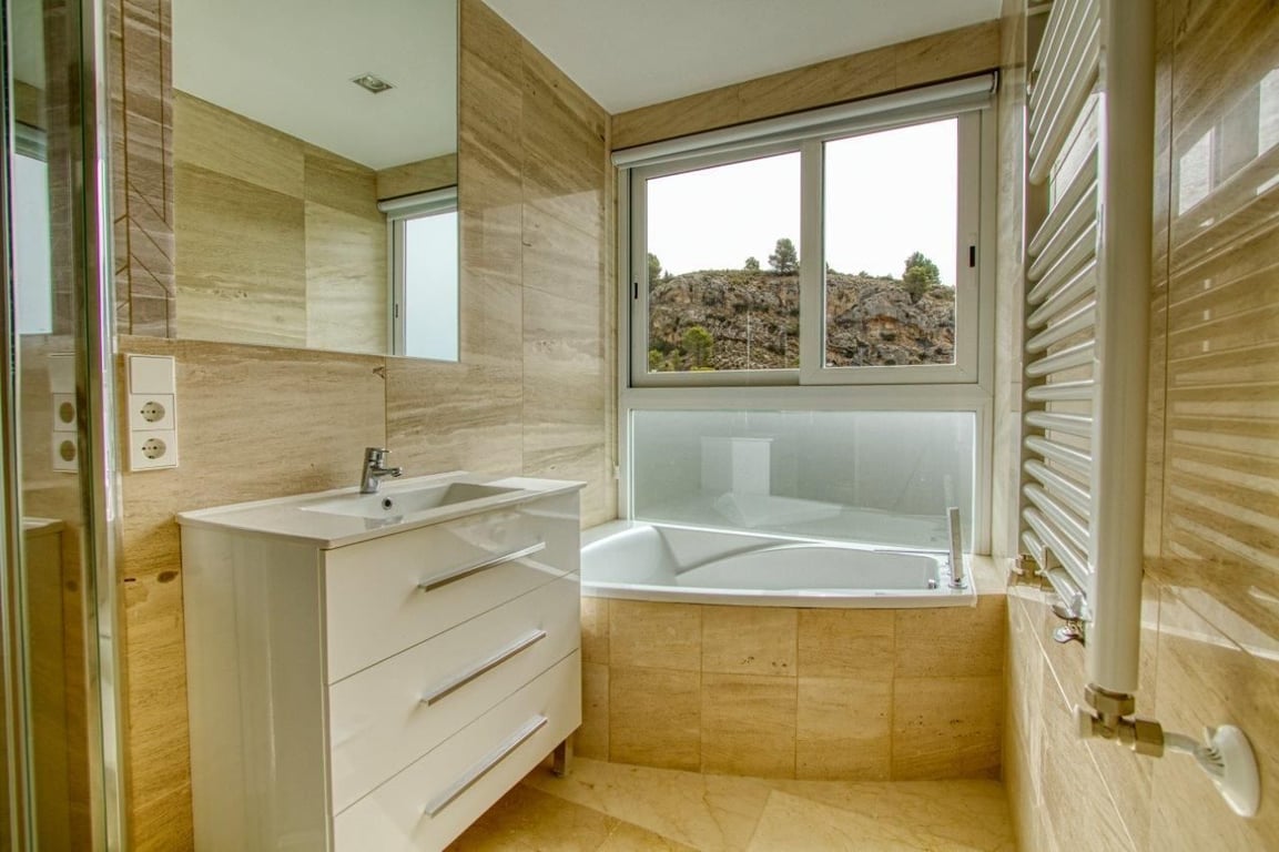 Fascinating villa in a private residential complex with views of the Mediterranean Sea and the Benidorm coast.The villa is situated on top of a mountain with a unique environment with private access only for residents, ensuring greater privacy and security. Just 15 minutes from the beach and 30 minutes from BenidormThe property has an entrance with a panoramic terrace, open-air, and a foyer with access to stairs and elevator.Descending to the first floor, we find the area designated for the living space, with a spacious living-dining room and integrated kitchen, with direct access to the terrace featuring a barbecue, pergola, and private swimming pool, offering unique views of the sea. It is a very bright and comfortable area with high-quality construction and is surrounded by large windows, providing an exceptional environment. The kitchen includes an island, integrated appliances, a separate laundry area, and a stylish bathroom to complete the space.On the lower floor, intended for the sleeping area, there are 3 bedrooms, each with a walk-in closet and a private bathroom.Independent area designated for machinery.The access to each floor can be done via the designer staircase or the private elevator within the property.The Villa has:heated cascade pool.air conditioning (HOT/COLD).natural gas heating.climalit windows, reinforced for security and insulation.garage with automatic door.barbecue area BARBECUE AREA.