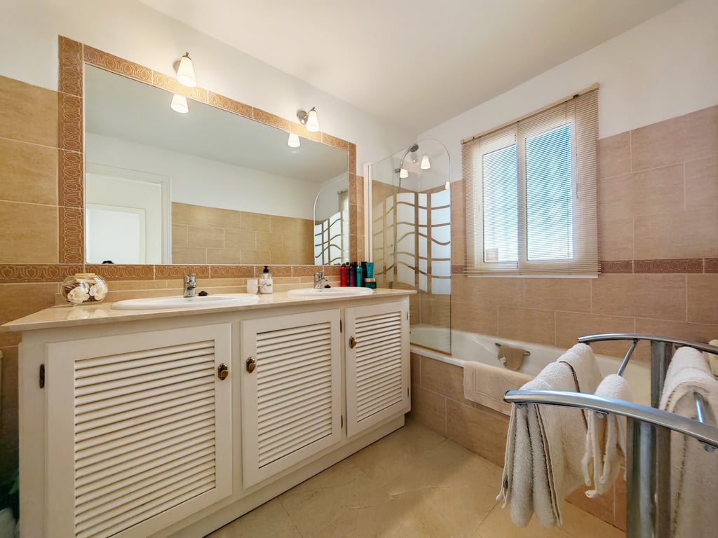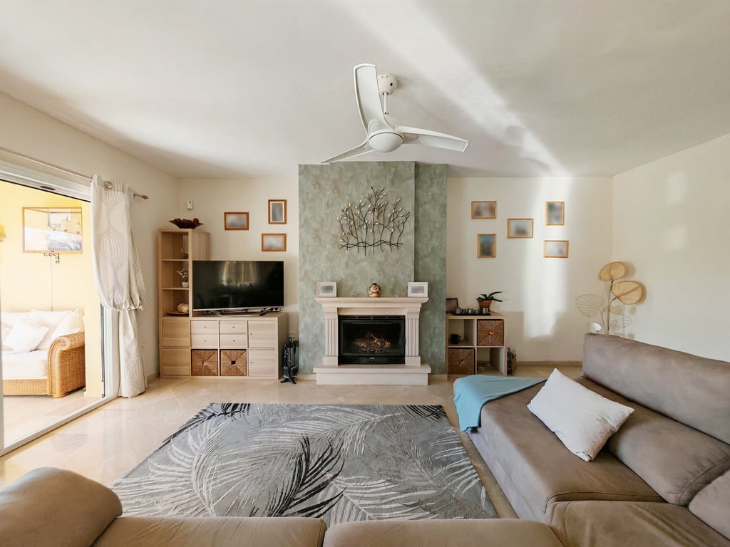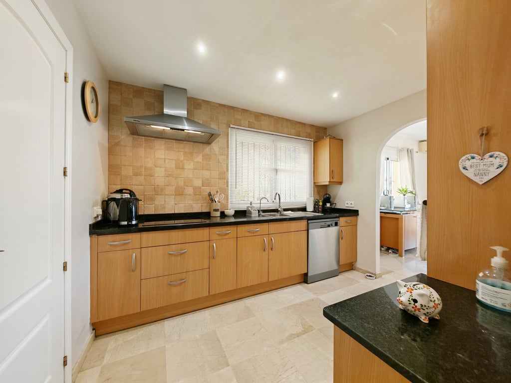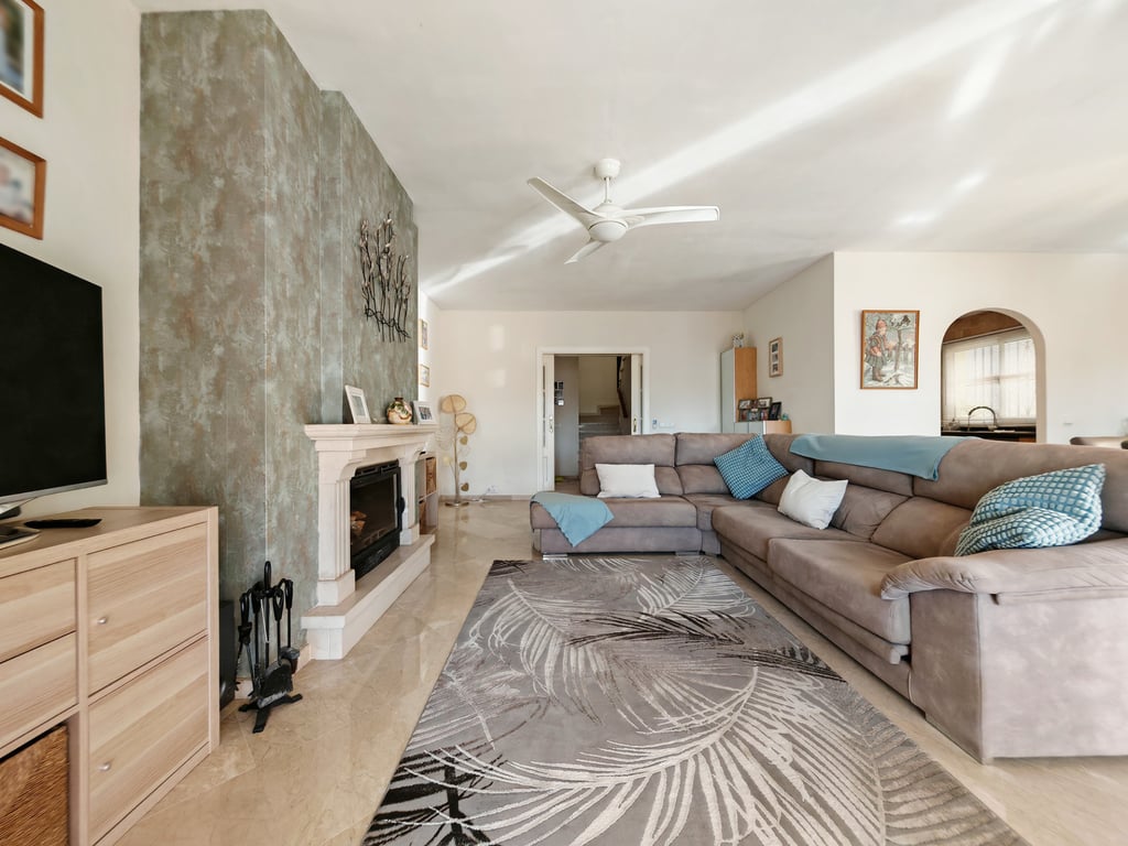 Het ruime interieur beschikt over een moderne, volledig uitgeruste keuken met een grote boog die de eetkamer verbindt, perfect voor familiebijeenkomsten of het ontvangen van gasten. De royale woonkamer, compleet met een stijlvolle open haard en grote schuifdeuren, geeft toegang tot een ruim terras – een ideale plek om buiten te dineren en te ontspannen. Deze woning heeft drie lichte en ruime slaapkamers en drie badkamers, waaronder een en-suite badkamer bij de hoofdslaapkamer. Een trap leidt naar een van de hoogtepunten van de woning: een privé dakterras, ideaal voor zomerse bijeenkomsten of om te ontspannen onder de sterrenhemel.