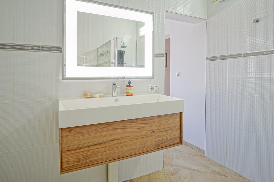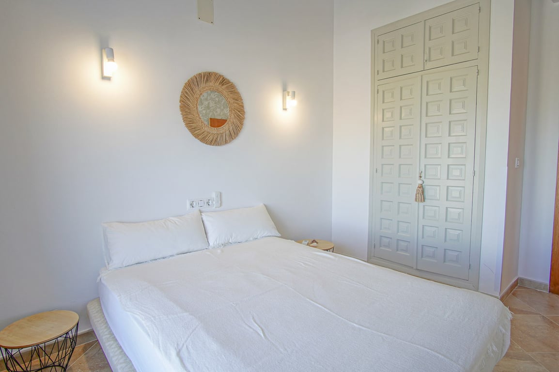 Als je binnenkomt via de carport, uitgerust met een oplaadpunt voor elektrische auto's, word je begroet door een entree die comfortabel en functioneel is ingedeeld, zonder trappen. Hier vind je een ruime woonkamer en een moderne keuken, beide met grote ramen waardoor je kunt genieten van het spectaculaire uitzicht. Op deze verdieping vind je twee slaapkamers en een hoofdslaapkamer met en-suite badkamer; alle kamers hebben directe toegang tot het terras, wat zorgt voor een continue verbinding met buiten en een lichte en uitnodigende sfeer. De naya, een overdekte buitenruimte ideaal om te ontspannen, nodigt je uit om te genieten van het mediterrane klimaat terwijl je uitkijkt over de zee en het privézwembad, met de perfecte barbecueplaats voor familiebijeenkomsten of met vrienden.