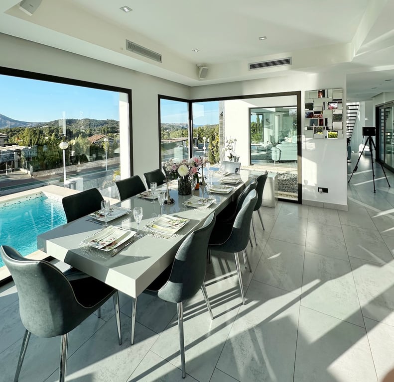 Gelegen in een van de meest exclusieve woonwijken van Jávea, biedt deze uitzonderlijke luxe villa de perfecte combinatie van eigentijds design, hoogwaardige afwerkingen en adembenemend uitzicht over de vallei, de Montgó en zelfs deels op zee. Verdeeld over drie verdiepingen en 525 m² zorgvuldig ontworpen leefruimte, geniet u hier van een exclusieve levensstijl in een prachtige natuurlijke omgeving, op een perceel van 1.680 m². De villa beschikt over vijf ruime slaapkamers, elk met een eigen en-suite badkamer, wat privacy en comfort garandeert voor zowel familie als gasten. Dankzij de kamerhoge ramen hebben alle slaapkamers schitterend uitzicht over de omliggende vallei. De royale open woon- en eetruimte is gevuld met natuurlijk licht en verbindt de binnen- en buitenruimtes op een harmonieuze manier. Een indrukwekkende zwevende trap met glazen balustrade verbindt de verschillende verdiepingen en geeft een extra architectonisch accent. Geniet van luxe wellnessvoorzieningen, waaronder een verwarmd binnenzwembad, een Hammam en een volledig uitgeruste fitnessruimte. Buiten vindt u twee zwembaden — een infinity pool met panoramisch uitzicht en een tuinzwembad met fontein en ondiep gedeelte voor kinderen. Meerdere terrassen, een jacuzzi en een volledig ingerichte zomerkeuken maken het buitenleven compleet. De woning is voorzien van moderne technologie, waaronder een slim domoticasysteem, Sonos-geluidssysteem en een 18 kW zonne-installatie met batterijopslag. Er is bovendien een fantastische privébioscoop voor gezellige filmavonden. Verder is er een laadpunt voor elektrische voertuigen, airconditioning door de hele woning en prachtig aangelegde, perfect onderhouden tuinen die rust en privacy bieden. De villa ligt op korte afstand van internationaal gerenommeerde scholen, schitterende stranden en een uitgebreid aanbod van restaurants en vrijetijdsactiviteiten. Dit maakt het de ideale woning als gezinsverblijf, tweede huis of investeringsobject met bewezen verhuurpotentieel. Belangrijkste kenmerken: 5 ruime slaapkamersDeels zeezicht3 zwembadenSaunaPrivébioscoopIdeaal familiehuisUitstekend verhuurpotentieel Neem vandaag nog contact met ons op voor meer informatie of om een bezichtiging te plannen.
