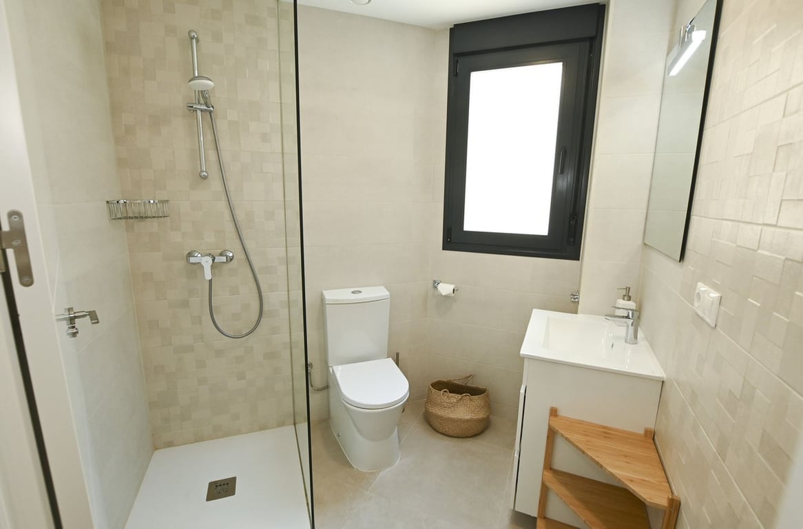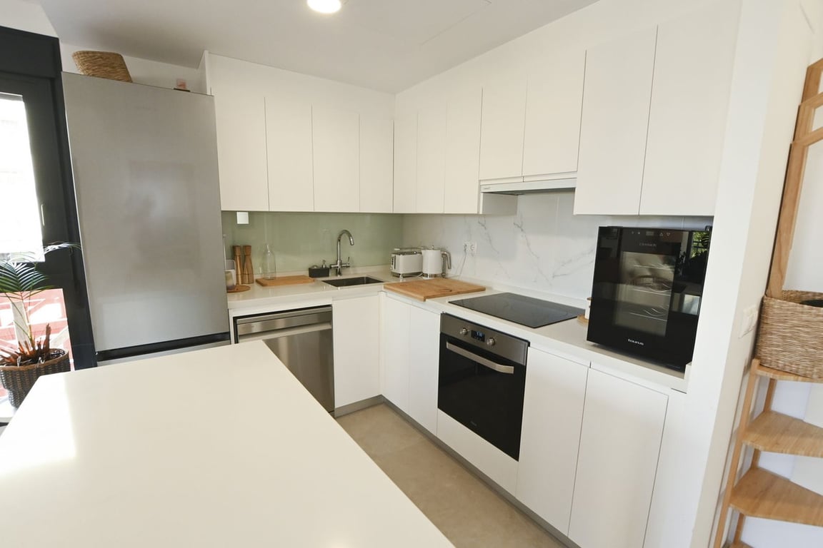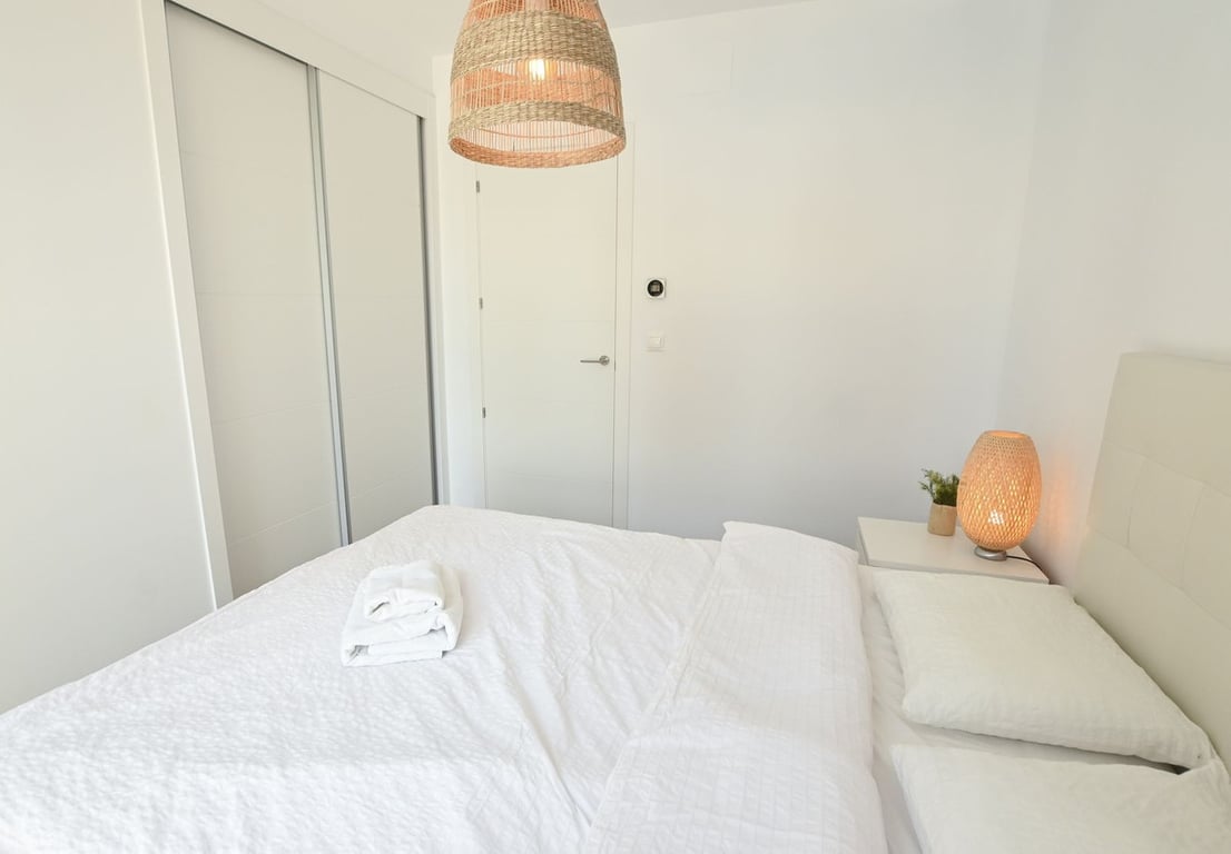 Modern apartment on the first floor of a block built in 2021, right on the Arenal Bol beach in Calpe and close to all services. The property consists of two double bedrooms, two bathrooms, one of which is connected to the bedroom, a fully equipped, modern kitchen with an island, with an open-plan dining room and living room, and a terrace overlooking the sea. The apartment is very bright and cozy, for sale partially furnished. In the equipment: ducted hot and cold air conditioning, double windows with external blinds, bathroom equipment, bedroom equipment, furniture and household appliances, built-in wardrobes in the bedrooms. On the premises there is a communal swimming pool for use by residents.