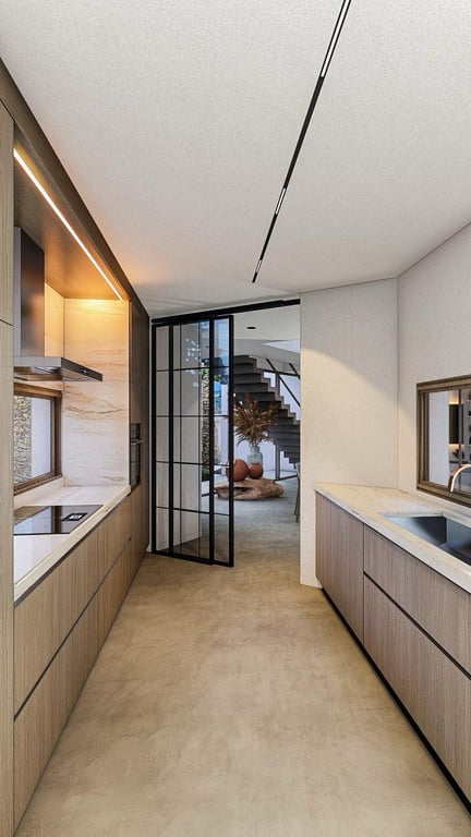Het huis is verdeeld over twee verdiepingen. Op de begane grond is er een ruime dubbelhoog woonkamer met grote ramen die het interieur overspoelen met natuurlijk licht en direct uitkomen op het zwembad. Daarnaast zijn er een eetkamer, een volledig uitgeruste onafhankelijke keuken met de beste apparaten en meubels, een slaapkamer en een complete badkamer. De keuken is direct verbonden met een volledig uitgeruste buitenbarbecue met uitzicht op de zee.
