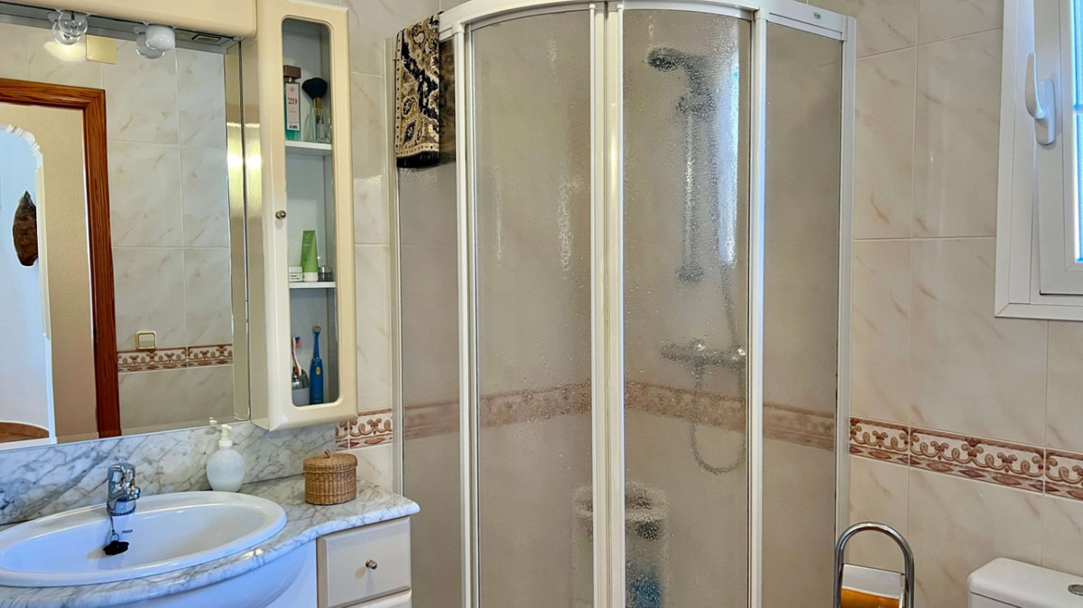 Deze Spaanse villa, gelegen in een rustige buurt en dichtbij het strand van Calpe, is een eigendom met opties!  Ze heeft 3 verdiepingen, een zeer ruime garage waarvan een deel kan worden voorzien als studio, een bijhuisje met eigen terras, privé zwembad met buitendouche, stenen barbecue, en zo veel meer. Op de begane grond vind je behalve de inpandige garage ook een grote bergruimte, een badkamer en slaapkamer . De eerste verdieping bevindt zich de hoofdingang met een hal, een lichte woon- en eetruimte, een volledig uitgeruste keuken, slaapkamer en een badkamer. Het hoogste niveau voorziet nog drie slaapkamers en een badkamer. De eigendom is volledig omheind terrein en wordt gemeubileerd verkocht.