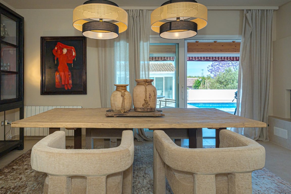 Property DescriptionCompletely renovated villa ready for occupancy in 2025 with luxury qualities for sale in Denia (Alicante). It is located in the Montgó area, offering an exclusive atmosphere of the Costa Blanca. It features a contemporary architectural design with high-end finishes and spacious terraces with glass curtains. Highlighted are its large windows and clear views of the mountain, as well as a well-kept Mediterranean garden and a majestic south-facing private pool, which inundates the home with natural light. The interior layout has been carefully designed with every detail in mind for your comfort in a modern villa. A very spacious living-dining room with a fireplace integrates with the fully equipped modern open kitchen and high-quality furniture. The bedrooms have built-in wardrobes made with high-quality woods, and the luxury finishes include split air conditioning in the bedroom, central heating, double glazing, and a beautiful fireplace. Additionally, the property offers a large closed garage at the entrance, plus another outside and a parking area, as well as a huge storage room, completing the day-to-day amenities. Outside, the villa features extensive leisure and wellness areas. Next to the large swimming pool is a summer kitchen, perfect for outdoor gatherings, along with an outdoor shower. The spacious covered terrace allows you to enjoy the Mediterranean climate in any season. The extensive private garden surrounds the home, creating an ideal environment for relaxation. Other notable services include a private garage and additional storage rooms. Key PointsLarge spaces: 4 bedrooms, 2 bathrooms, and a guest toilet (359 m²) on a plot of 1,888 m². One of the bedrooms converted into a living room and library.Single level and large plot: the entire house on the same level located on a large plot.Views of the MontgóCompletely renovated in 2025 with luxury finishes and modern American kitchen.Sunny all year round.Spacious private pool and Mediterranean garden, south-facing, very sunny.Large living-dining room with fireplace and panoramic windows.Outdoor summer kitchen and outdoor shower to enjoy the climate.Large capacity closed garages and additional storage rooms for storage. More than enough space to keep your cars and personal belongings.Climate control and comfort: central heating, double glazing, quiet and peaceful area.Prime location at the foot of the Montgó in Denia, near Las Rotas beach and main roads.