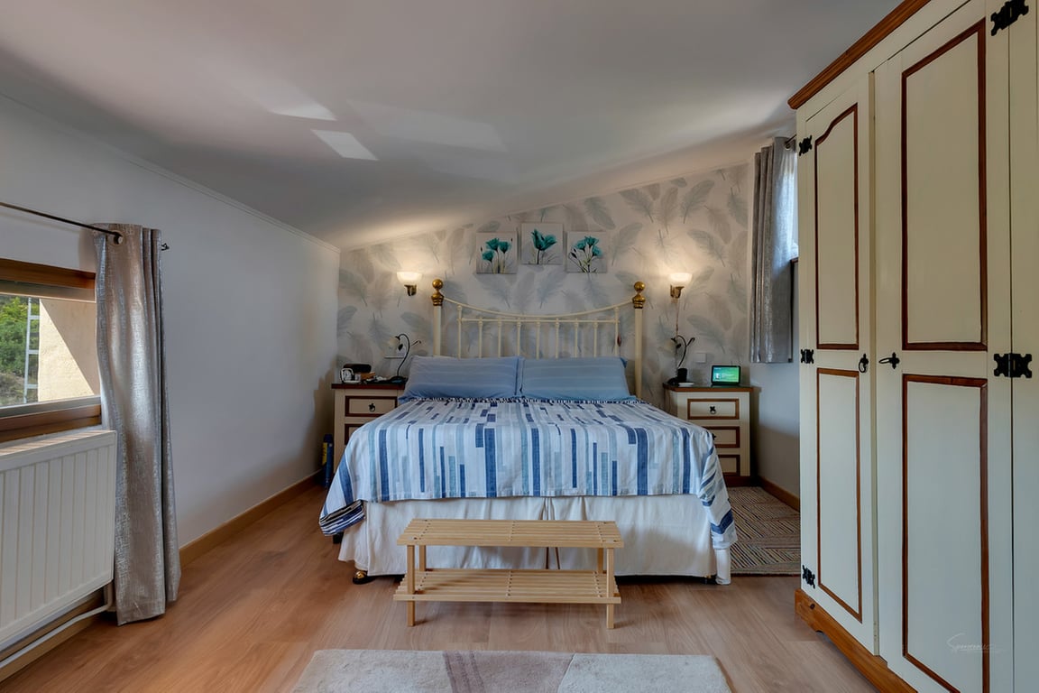 The entrance hallway is a lovely, welcoming reception room which leads to the living spaces. The open aspect, fully equipped kitchen and living room has a warm, cozy feel and benefits from central heating and a free standing, pellet burner. From here, there is a separate dining room which opens into a lounge with fabulous, floor to ceiling, sliding doors. This brings the outside in, with stunning views across the garden, and swimming pool and out to the surrounding countryside. The living spaces are flooded with natural light, thanks to the large windows and glass doors, yet the character of the home has been cleverly retained with beautiful original features.