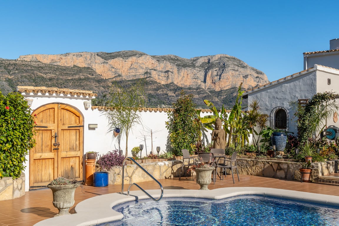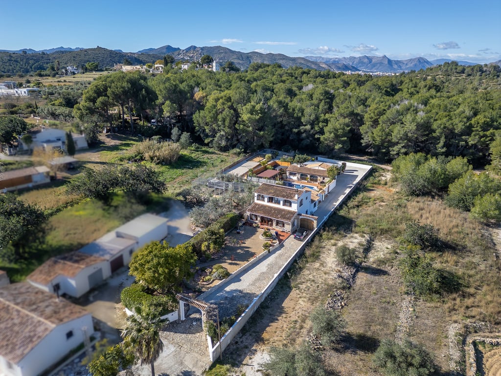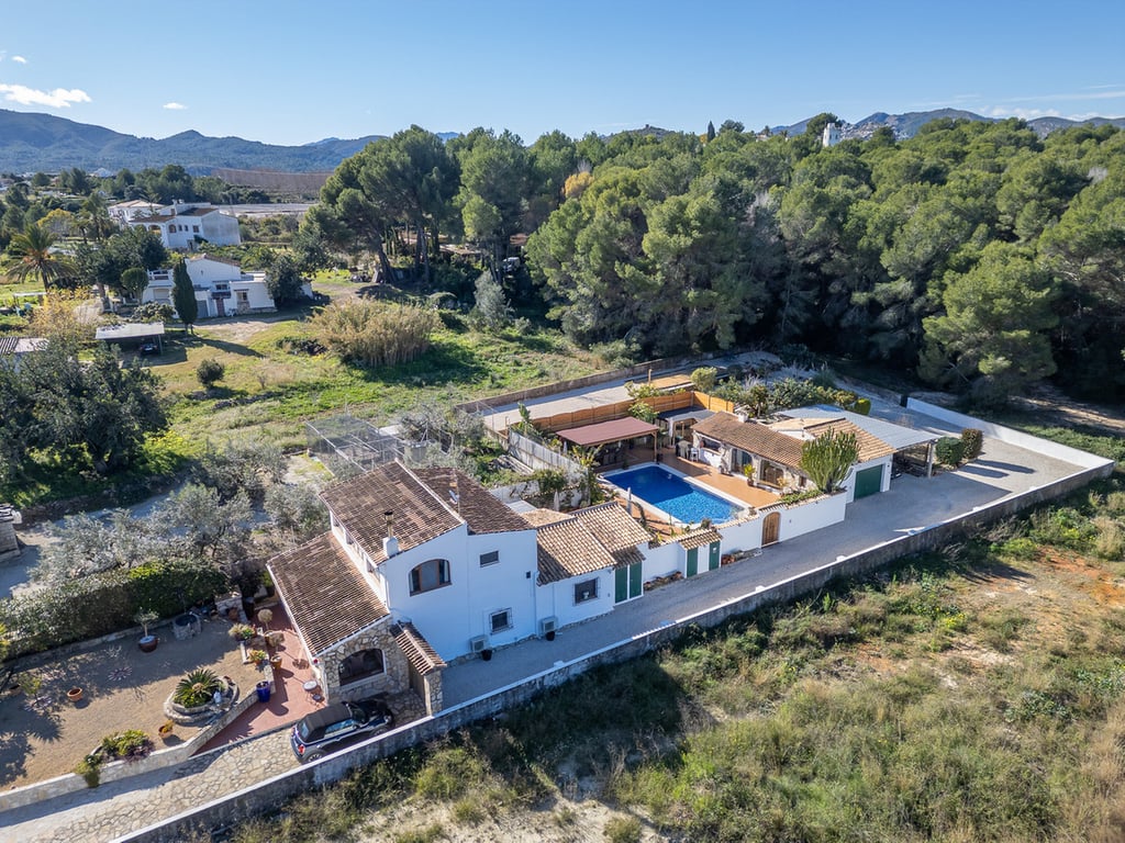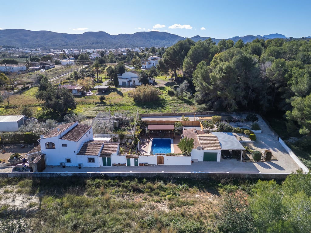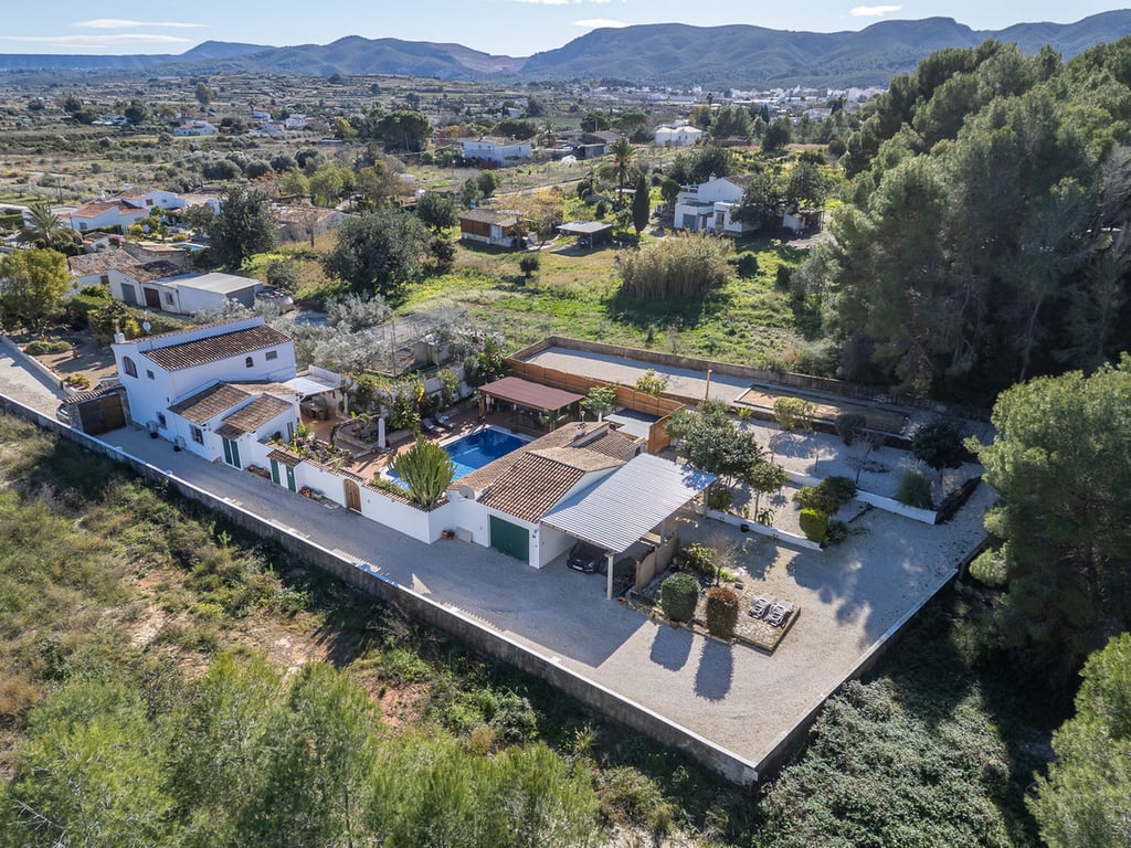 This expansive country finca, with a stunning three-bedroom villa, within a ten-minute walk of the pretty Spanish village of Jesús Pobre, has recently been reduced for a quick sale. The finca is situated in a peaceful location with incredible views, yet it is within close proximity to the town of Gata de Gorgos and the coastal towns of Javea and Denia.  This stunning finca offers a wonderful sense of privacy and tranquillity combined with modern elegance and convenience. The finca is accessed via a quiet lane with a sweeping driveway and the beautifully renovated villa is centrally positioned within the generous 2,426 m² flat plot. Nestled beside the Montgó Natural Park, it enjoys stunning views of the Montgó mountain and the surrounding countryside, with even a glimpse of the Mediterranean sea at Jávea. The house is flooded with sunlight throughout the day. Its current owners have impeccably refurbished the property in recent years and the thoughtful design means that from every aspect of the indoor and outdoor living spaces there is a sense of complete peace, privacy, and tranquillity. The driveway and entrance to the property offer exceptional "kerb appeal" and there is ample parking for several vehicles. The covered naya is fully glazed and offers unspoiled views of Montgó, this is a stunning outdoor living space for year round use. From here, you enter the very spacious, open plan living and dining room, which features beamed ceilings, Tosca fascias, and a wood burner. The separate, fully fitted modern kitchen and the master suite are accessed from this room. The master bedroom, with fitted wardrobes and a large ensuite shower room, has patio doors offering direct access to the garden terrace.  Stairs lead from the living area to the first-floor landing, which is very spacious. There is easily space to create an office or additional accommodation. From here, a family bathroom is shared by two double bedrooms, both of which boast superb views. Downstairs, the kitchen opens onto a beautiful, private, walled garden terrace. It is richly planted with a variety of Mediterranean flora, and features several distinct seating areas. The recently refurbished 10 x 5 m swimming pool is surrounded by open terrace. In addition, there is a summer kitchen and dining area, an outdoor utility room with a bathroom and a specially designed kennel for furry friends. The outdoor living spaces offer complete peace and tranquillity. With everything you need for outdoor, living and entertaining, this is your own private paradise. Furthermore, to the outside, there is a large garage, a carport, a pétanque pitch, and an orchard with pedestrian access to the countryside and woodland. From here there is a lovely scenic trail to Jesús Pobre which is famous for its Sunday market, which showcases the artisan products that the area is famous for. There is a wonderful sense of community in the village between expats and local residents. The property boasts traditional features and amenities, including Tosca walls, beamed ceilings, a wood burner, gas central heating with radiators, fibre-optic internet, security cameras, double glazing, a septic tank, mains water, and mains electricity. The location of the finca is absolutely idyllic. Situated a short walk from Jesús Pobre and just a 15-minute drive from Jávea's beautiful beaches, with everything close by. Peace and tranquility in spades, yet sports and golf facilities, horse riding, hiking trails and cycling routes are all within easy reach. A peaceful rural lifestyle yet with easy access to the hustle and bustle of the coastal resorts on the Costa Blanca. This outstanding property offers an incredible lifestyle opportunity. Furthermore, in view of its recent price reduction, it also represents an amazing investment opportunity! Must be viewed to appreciate all it has to offer! Call now for more information and a viewing appointment.