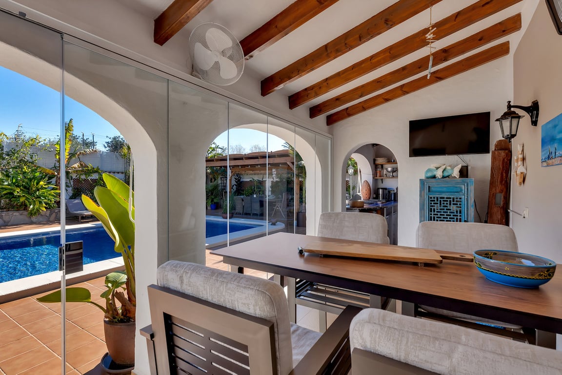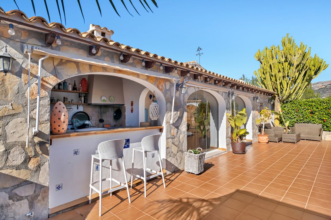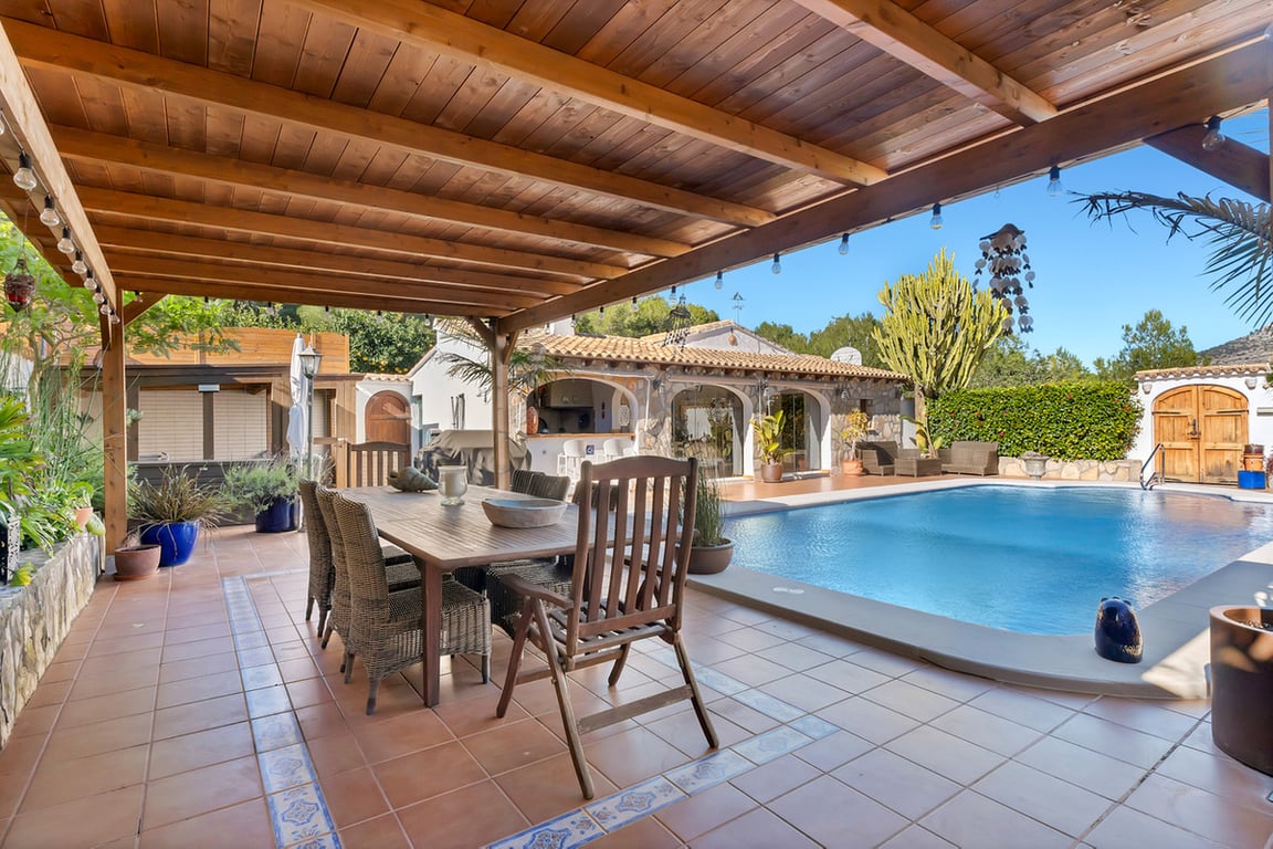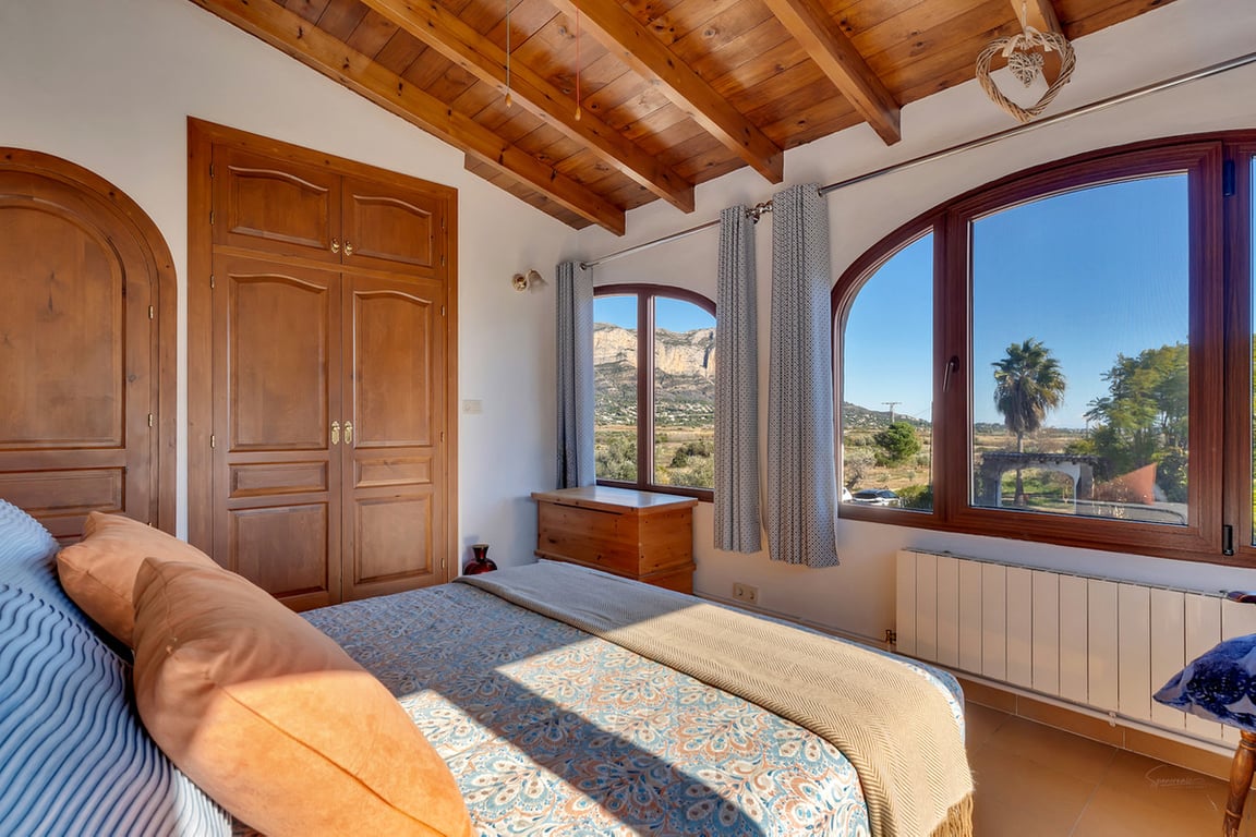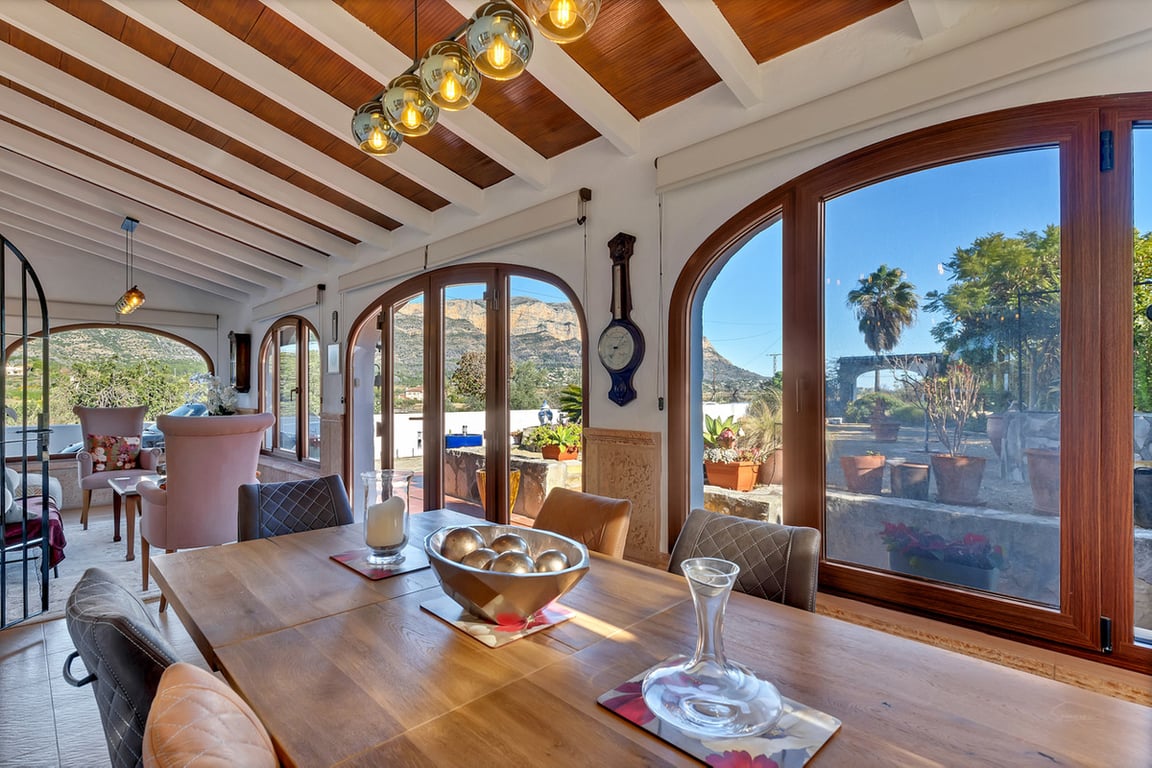 This expansive country finca, with a stunning three-bedroom villa, within a ten-minute walk of the pretty Spanish village of Jesús Pobre, has recently been reduced for a quick sale. The finca is situated in a peaceful location with incredible views, yet it is within close proximity to the town of Gata de Gorgos and the coastal towns of Javea and Denia.  This stunning finca offers a wonderful sense of privacy and tranquillity combined with modern elegance and convenience. The finca is accessed via a quiet lane with a sweeping driveway and the beautifully renovated villa is centrally positioned within the generous 2,426 m² flat plot. Nestled beside the Montgó Natural Park, it enjoys stunning views of the Montgó mountain and the surrounding countryside, with even a glimpse of the Mediterranean sea at Jávea. The house is flooded with sunlight throughout the day. Its current owners have impeccably refurbished the property in recent years and the thoughtful design means that from every aspect of the indoor and outdoor living spaces there is a sense of complete peace, privacy, and tranquillity. The driveway and entrance to the property offer exceptional "kerb appeal" and there is ample parking for several vehicles. The covered naya is fully glazed and offers unspoiled views of Montgó, this is a stunning outdoor living space for year round use. From here, you enter the very spacious, open plan living and dining room, which features beamed ceilings, Tosca fascias, and a wood burner. The separate, fully fitted modern kitchen and the master suite are accessed from this room. The master bedroom, with fitted wardrobes and a large ensuite shower room, has patio doors offering direct access to the garden terrace.  Stairs lead from the living area to the first-floor landing, which is very spacious. There is easily space to create an office or additional accommodation. From here, a family bathroom is shared by two double bedrooms, both of which boast superb views. Downstairs, the kitchen opens onto a beautiful, private, walled garden terrace. It is richly planted with a variety of Mediterranean flora, and features several distinct seating areas. The recently refurbished 10 x 5 m swimming pool is surrounded by open terrace. In addition, there is a summer kitchen and dining area, an outdoor utility room with a bathroom and a specially designed kennel for furry friends. The outdoor living spaces offer complete peace and tranquillity. With everything you need for outdoor, living and entertaining, this is your own private paradise. Furthermore, to the outside, there is a large garage, a carport, a pétanque pitch, and an orchard with pedestrian access to the countryside and woodland. From here there is a lovely scenic trail to Jesús Pobre which is famous for its Sunday market, which showcases the artisan products that the area is famous for. There is a wonderful sense of community in the village between expats and local residents. The property boasts traditional features and amenities, including Tosca walls, beamed ceilings, a wood burner, gas central heating with radiators, fibre-optic internet, security cameras, double glazing, a septic tank, mains water, and mains electricity. The location of the finca is absolutely idyllic. Situated a short walk from Jesús Pobre and just a 15-minute drive from Jávea's beautiful beaches, with everything close by. Peace and tranquility in spades, yet sports and golf facilities, horse riding, hiking trails and cycling routes are all within easy reach. A peaceful rural lifestyle yet with easy access to the hustle and bustle of the coastal resorts on the Costa Blanca. This outstanding property offers an incredible lifestyle opportunity. Furthermore, in view of its recent price reduction, it also represents an amazing investment opportunity! Must be viewed to appreciate all it has to offer! Call now for more information and a viewing appointment.
