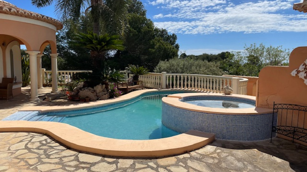 Sitting high above the famous beach of Granadella is this unique and enchanting villa. Set on a quiet road, a private gated driveway leads to a path through an archway that reveals exotic gardens with a waterfall that cascades into a lagoon pool surrounded by terraces with vibrant flowers, tall palms and pretty sitting areas. and on to the entrance of the house. On the ground floor is a hallway leading to the spacious lounge with views to the pool and the sea beyond. A stylish open plan fitted kitchen with Bosch appliances leads off to a light, elegant dining room that also benefits from the wonderful views. Also on this floor is a double bedroom with high quality ensuite bathroom (twin basins + shower) and a study, which could also be used as another double bedroom, as the ensuite bathroom and guest wc are both connected. A curved stairway leads from the hallway up to the master suite with breathtaking views over the pool and gardens to the blue waters of the Mediterranean. The suite has a large roof terrace, where the waterfall starts it's descent to the swimming pool below, and has a luxurious ensuite bathroom with twin basins, shower and a circular jacuzzi bath offering more relaxing seaviews. The traditional curved design of this villa wraps around the focal point of the terraced naya and lagoon swimming pool with the jacuzzi sitting beneath the cascade of the waterfall. Also nestling under the palms next to the pool is a fully equipped outdoor entertaining and dining area with barbecue, outdoor kitchen + shower. More terraced gardens with palms, olive trees and exotic shrubs lie beyond and lead to a guest apartment in the gardens. The layout ensures total privacy and provides wonderful views to the sea from all aspects of the property. A magical spot of tranquil paradise on the Spanish Costa Blanca.