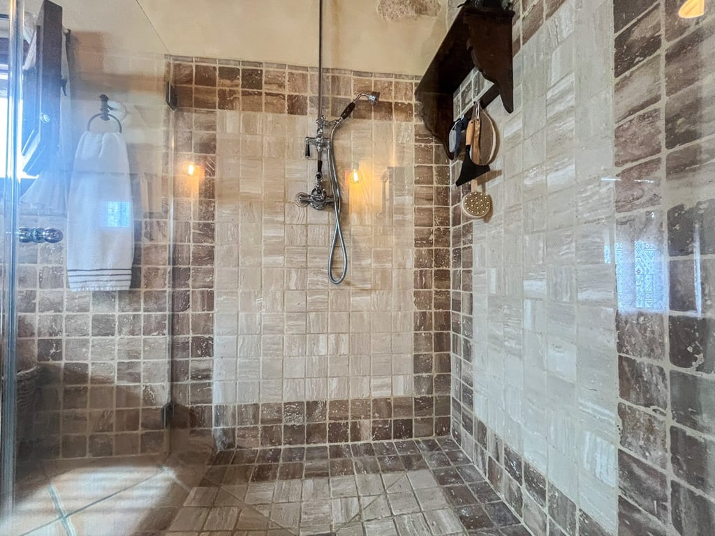 De hoofdslaapkamer is een droomsuite met een kleedkamer en zes inbouwkasten, en een aangrenzende spa-badkamer met een bubbelbad, inloopdouche en dubbele wastafel van massief hout . De andere kamers zetten deze rustieke elegantie voort met een combinatie van natuurlijke elementen, zachte verlichting en hoogwaardig meubilair.